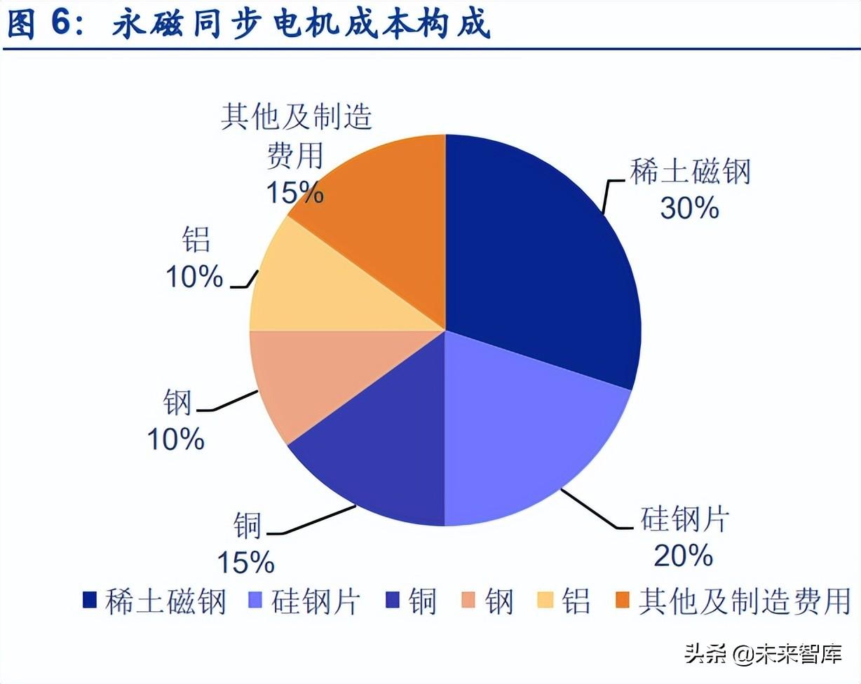 在永磁同步电机成本中,稀土磁钢成本占比最高。永磁同步电机的制造原材料主要有稀土磁 钢、硅钢片、铜和铝等,其中稀土磁钢主要用于制造永磁体,成本构成在 30%左右;硅钢片 主要用于制作铁芯,成本构成在 20%左右;铜主要用于制作定子绕组,成本构成在 15%左 右;钢主要用于制作电机轴等结构组件,成本构成在 10%左右;铝主要用于制作电机壳,成 本构成在 10%左右。
