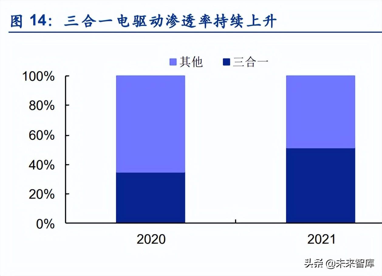 2020 年新能车乘用车三合一电驱动系统渗透率为 35%,2021 年渗透率同比上升 16 个百分 点,达到 51%。三合一电驱动总成渗透率稳步提高,主要驱动因素包括:1)三合一驱动系 统体积更小,可以实现车辆各系统的布局可以更加灵活,增加更大的储物空间和乘坐空间; 2)三合一驱动系统重量更轻,可以实现整车重量的下降,增加汽车续航里程;3)为主机厂 降低了供应商层面的管理成本、沟通成本,也减少了原有分散采购多个零部件的配套成本; 4)有利于车企的平台化设计,为不同车型搭载同一套系统。