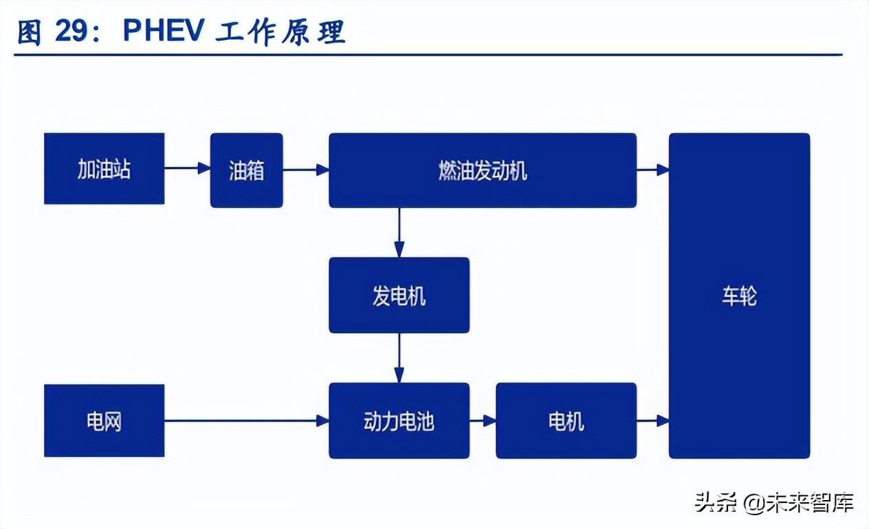 燃油车的主要问题是在低速、高速切换以及频繁启停等复杂的市区路况中,发动机很难长时 间保持在高热效率区间,油耗增大;而混动技术可以利用电机来辅助发动机,使得在起步和 加速过程中的整体效率得到提升,并使车辆整体油耗显著下降。随着电动化与智能化的逐步 推进, HEV 和 PHEV 作为传统车向新能车发展的中间阶段,最终纯电动车型会成为主要的 方向。