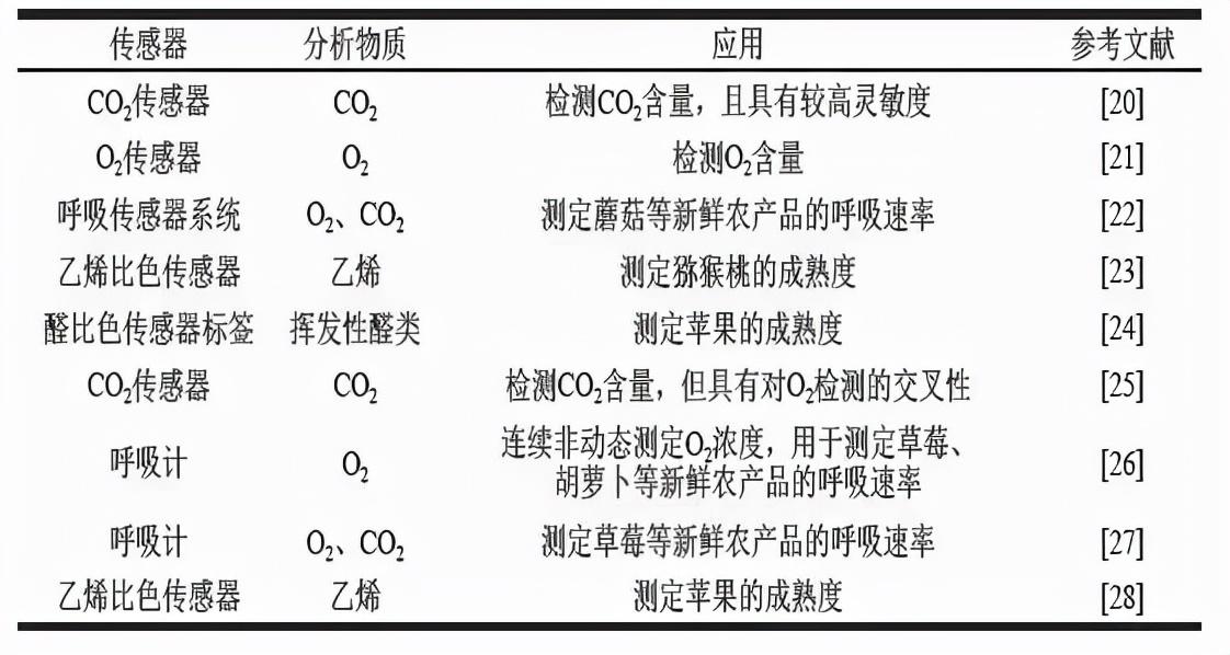 在蔬果的智能分拣及运输储存中,气体传感器旨在检测并指示气体或挥发性化合物(如O2、CO2、乙烯和其他特定气体)的存在和含量。气体传感器可通过对O2或CO2含量的检测来计算蔬果的呼吸速率,并可根据其提供的数据信息对果蔬的呼吸作用进行人工调节,从而降低蔬果的代谢损失。也可以通过对一些特定气体的监测或检测达到对蔬果新鲜度、成熟度检测的目的,下图表中总结了一些气体传感器在蔬果检测中的应用。