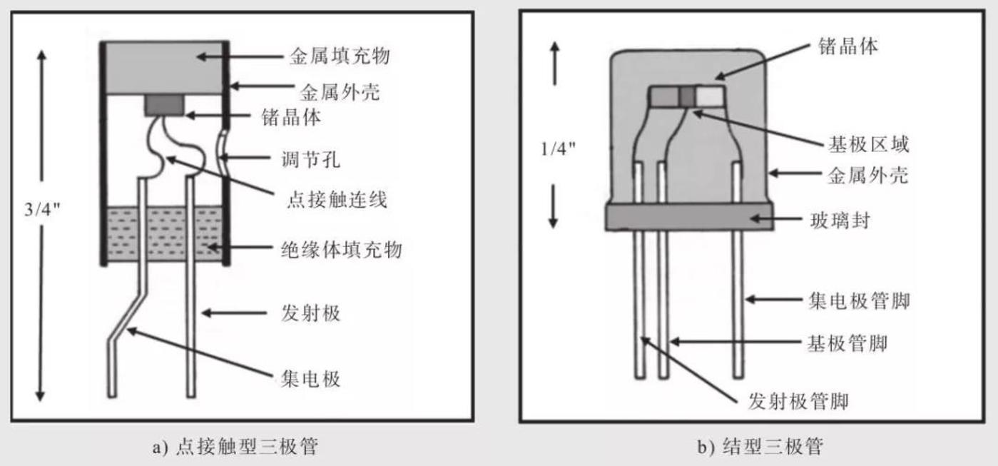 (巴丁、布莱顿发明的点接触型三极管和肖克利发明的结型三极管结构图)