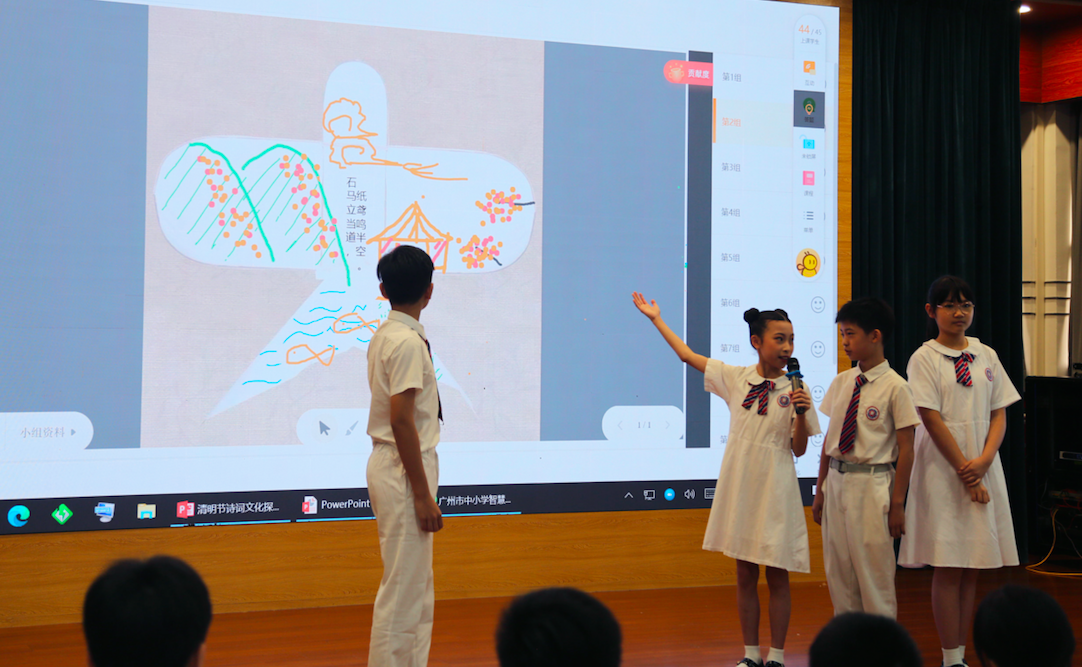 课堂上,陈老师运用广州智慧阅读平台,展示相关视频素材,鼓励学生积极分享他们对能表现清明节的色彩的理解。同学们诵读了与清明节相关的经典诗句,并展示各自学习单上与清明相关的活动。陈老师引导同学们认识清明节传统习俗背后所承载的祭祀祈福、家族团聚等文化内涵,培育学生对中华文化的热爱。在陈老师的指导下,同学们结合清明节的诗词,分组进行了清明节文创产品的设计,并运用智慧阅读平台评选出最受欢迎的策划文案。