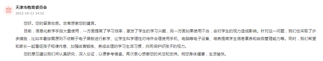 天津市教育委员会回复: