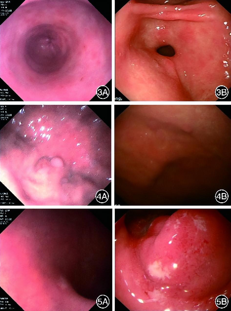 图3 糜烂的2种胃镜对比图 3A:便携式内镜拍摄;3B:奥林巴斯胃镜拍摄 图4 息肉的2种胃镜对比图 4A:便携式内镜拍摄;4B:奥林巴斯胃镜拍摄 图5 溃疡的2种胃镜对比图 5A:便携式内镜拍摄;5B:奥林巴斯胃镜拍摄