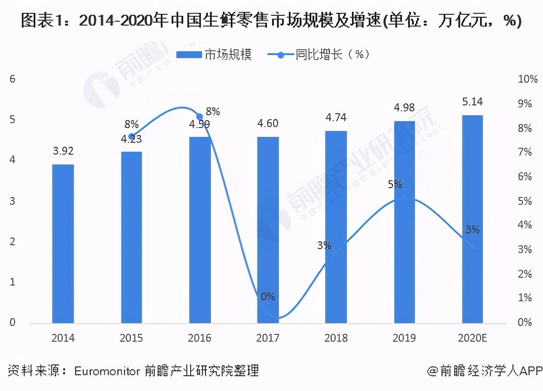生鲜零售作为新零售发展中的重要风口之一,拥有万亿级别的市场体量,是国民基础消费品产业,近年来增长态势稳定。根据Euromonitor数据显示,2019年国内生鲜零售市场总额达到4.98万亿元,同比增长5%,2020年市场规模超过5万亿元,2014-2020年CAGR为4.6%,呈稳步增长态势。