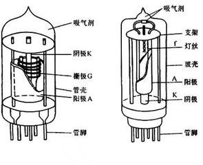 三极电子管 :在二极电子管的阳极和阴极之间靠近阴极的地方加装第三电极g(栅极),就形成了三极管。利用栅极来控制阴极向阳极发射电子的数量。其和晶体三极管的对应关系:阴极相当于发射极,栅极相当于基极,阳极相当于集电极,其电路组成如同晶体三极管基本放大电路,不过栅极加的是负偏压。三极电子管的缺点是极间电容大,放大系数低。