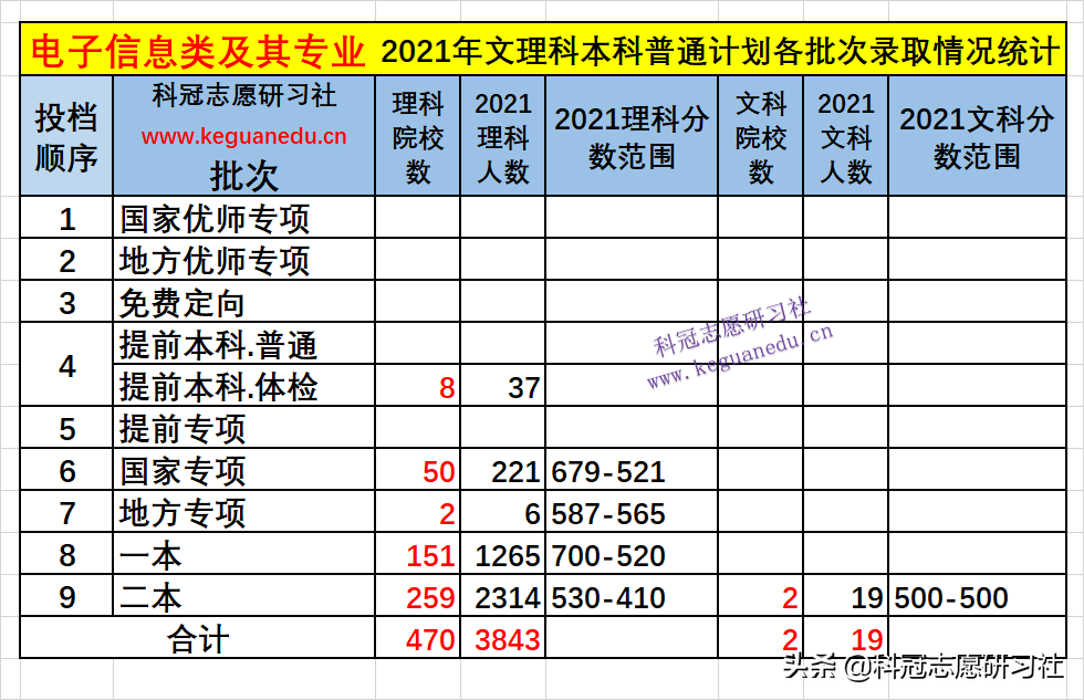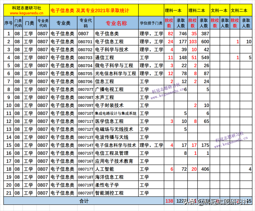 电子信息类 及其下的20 个专业2021年文理科本科所有批次的普通计划共录取 3862 人,理科院校数 470 所,录取人数 3843 人,文科院校数 2 所,录取人数 19 人。一本和二本普通计划录取人数:理科3579 人,招生院校数 410 所;文科 19 人,招生院校数 2 所。