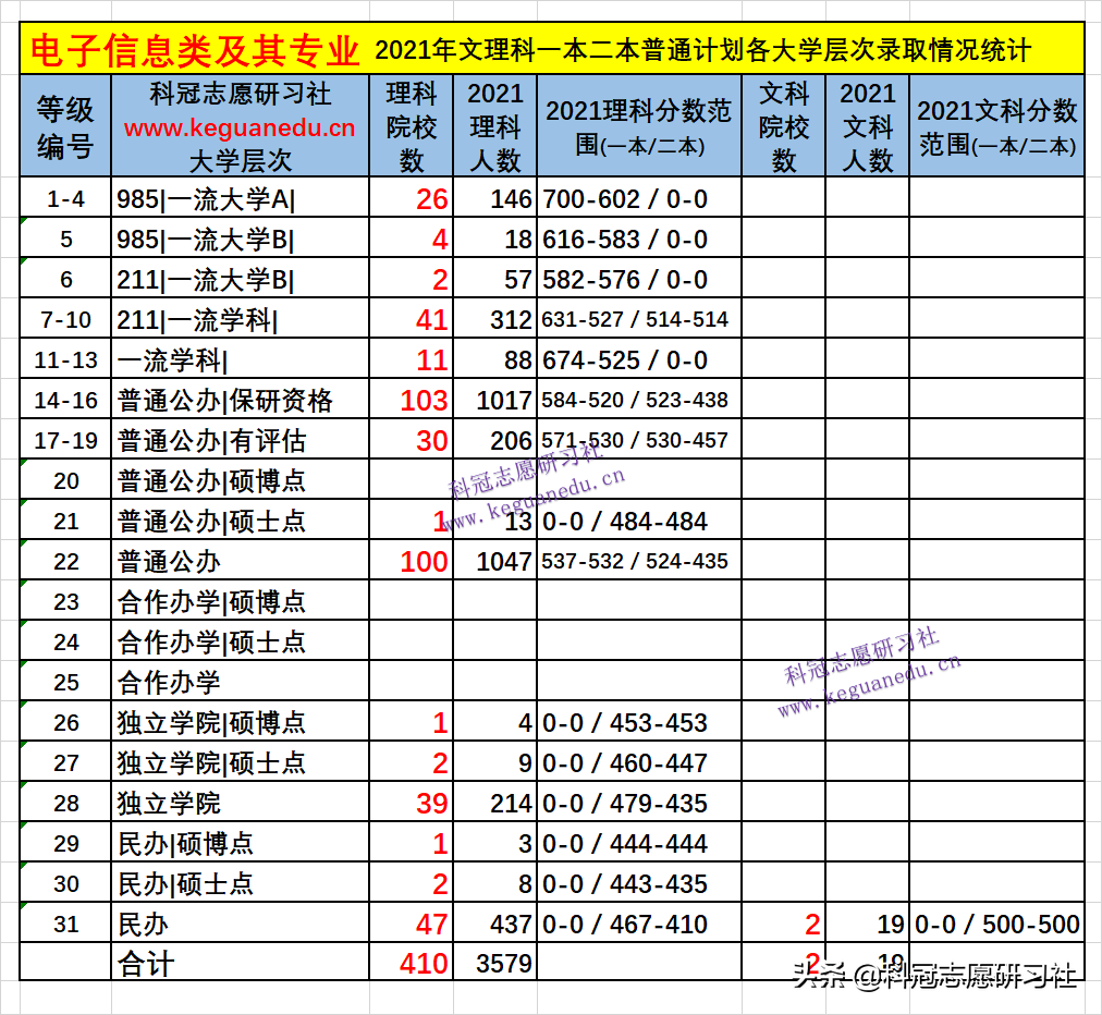 电子信息类及其专业,2021年文理科一本二本普通计划各大学层次录取情况统计 显示,理科院校数410 所,录取人数3579 人,其中:985院校30 所,录取人数 164 人;211院校43 所,录取人数 369 人。文科院校数2 所,录取人数19 人。