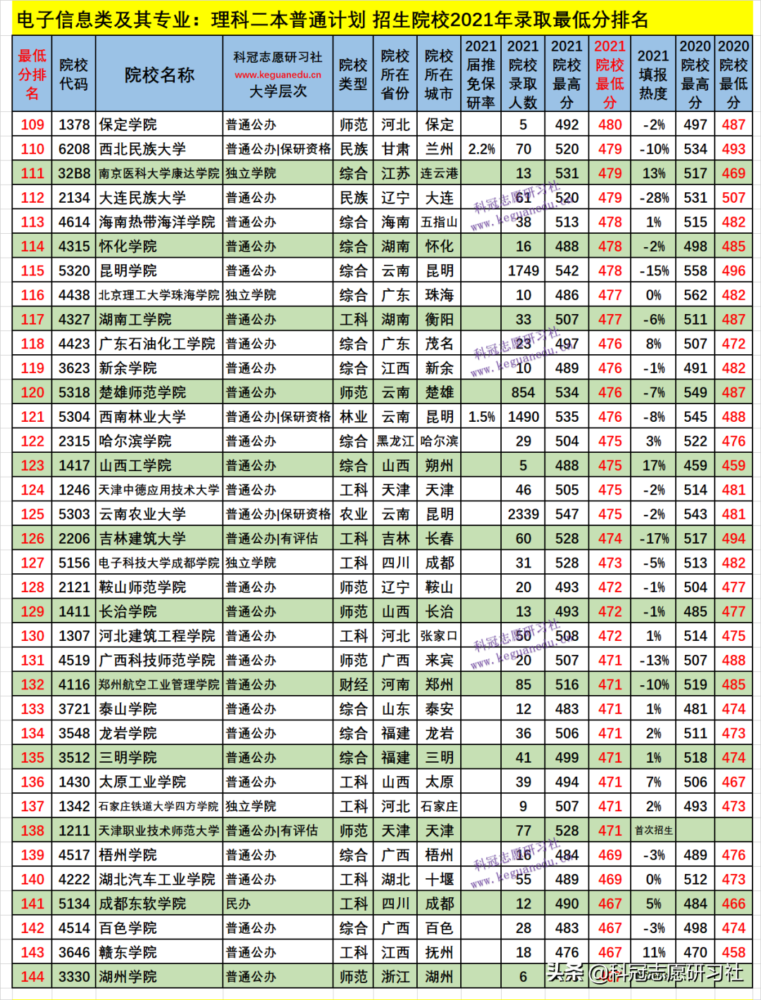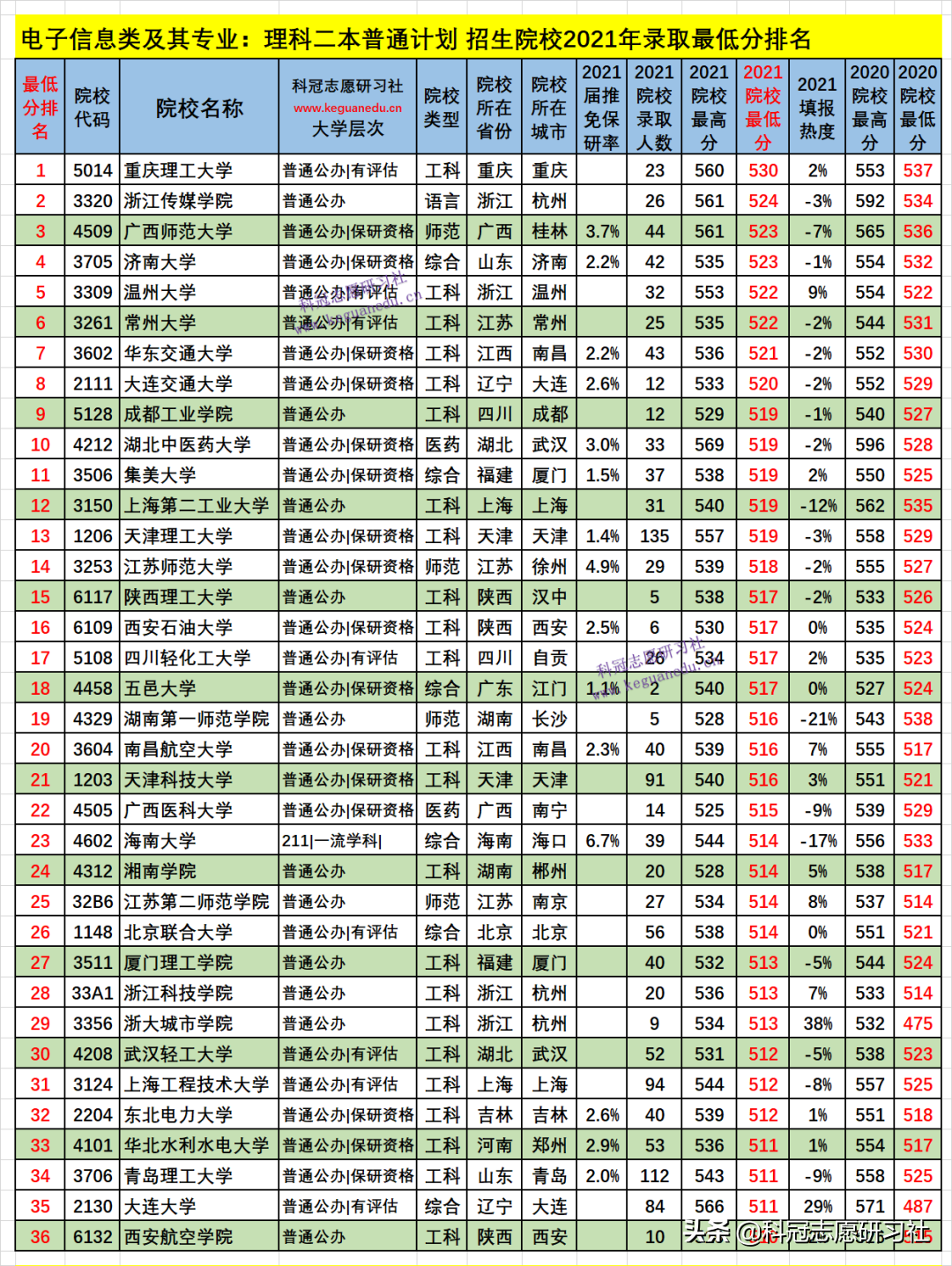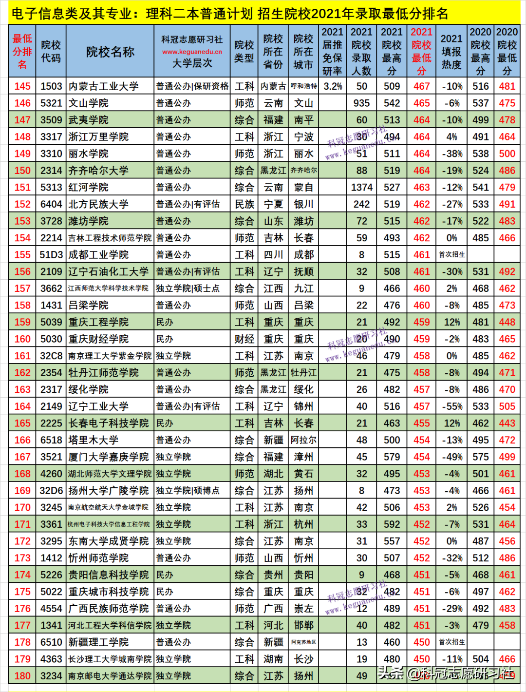 电子信息类及其专业:理科二本普通计划 招生院校数为 259 所,2021年院校最低分为 530-410 分,2021填报热度负波动最大的3所为:-130 %、河南工业大学(排名214 ),-90 %、安徽科技学院(排名241 ),-66 %、哈尔滨商业大学(排名196 );如此这样的负波动大的,其录取最低分和位次比上年要低,今年可以“捡漏”,而明年的录取位次一般情况又会提高;正波动最大的3所为:38 %、浙大城市学院(排名29 ),34 %、天津商业大学(排名56 ),29 %、大连大学(排名35 );如此这样的正波动大的,其录取最低分和位次比上年要高,一般情况今年考生填报可能“滑竿”。
