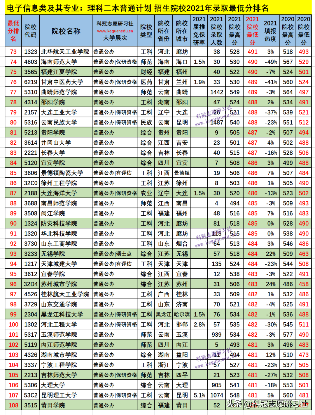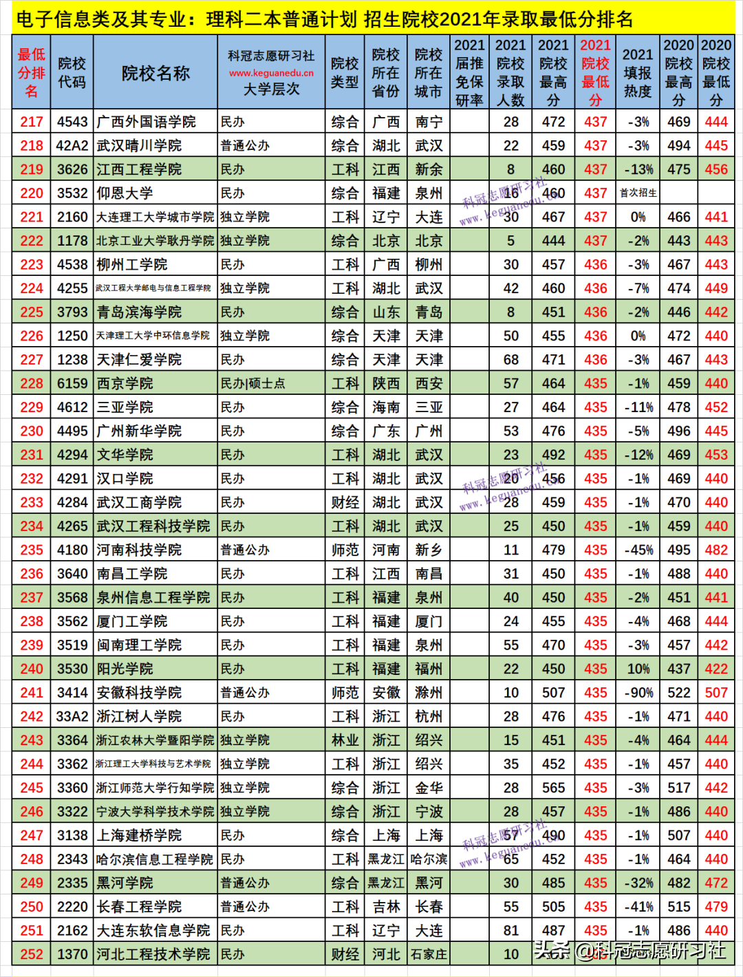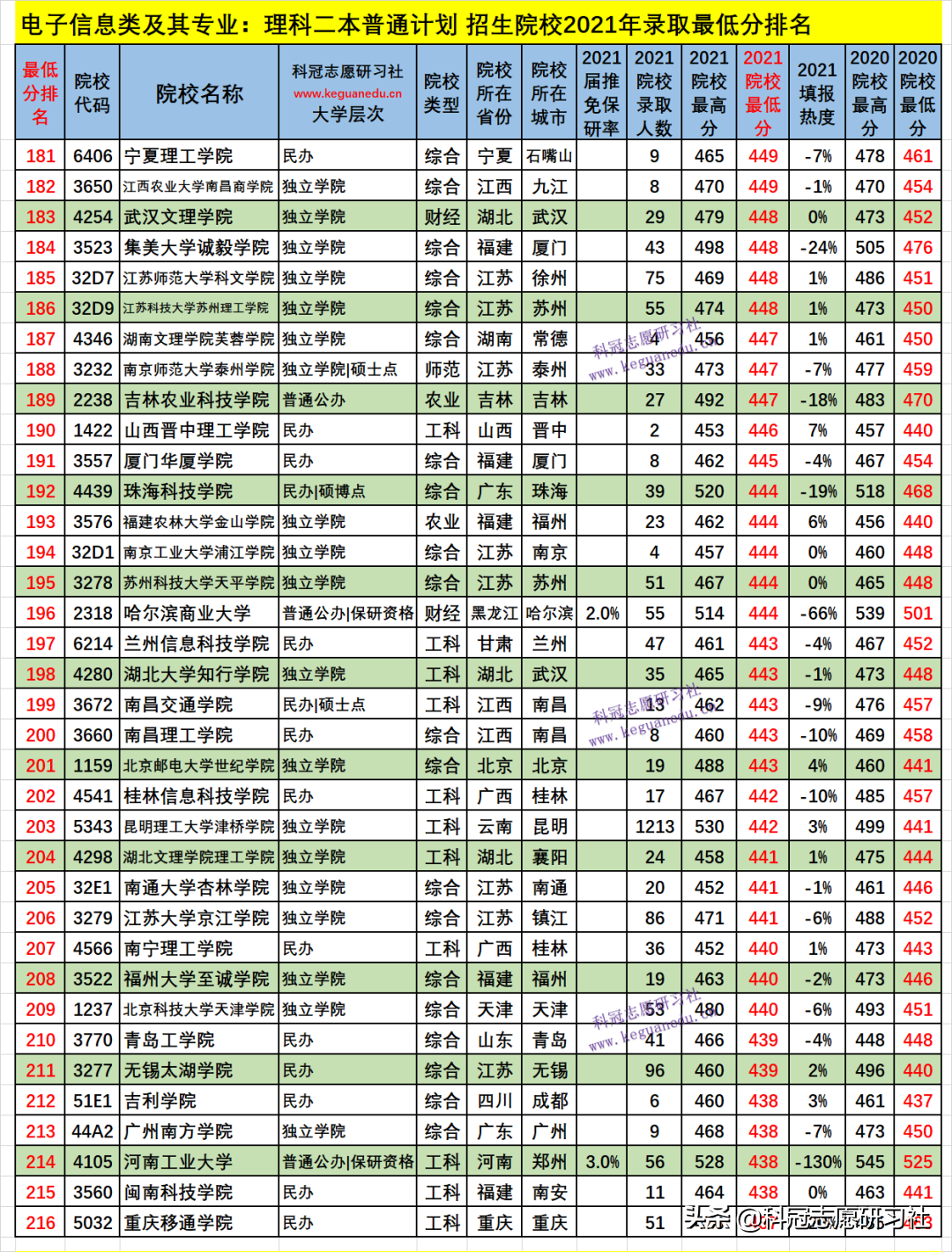 电子信息类及其专业:理科二本普通计划 招生院校数为 259 所,2021年院校最低分为 530-410 分,2021填报热度负波动最大的3所为:-130 %、河南工业大学(排名214 ),-90 %、安徽科技学院(排名241 ),-66 %、哈尔滨商业大学(排名196 );如此这样的负波动大的,其录取最低分和位次比上年要低,今年可以“捡漏”,而明年的录取位次一般情况又会提高;正波动最大的3所为:38 %、浙大城市学院(排名29 ),34 %、天津商业大学(排名56 ),29 %、大连大学(排名35 );如此这样的正波动大的,其录取最低分和位次比上年要高,一般情况今年考生填报可能“滑竿”。