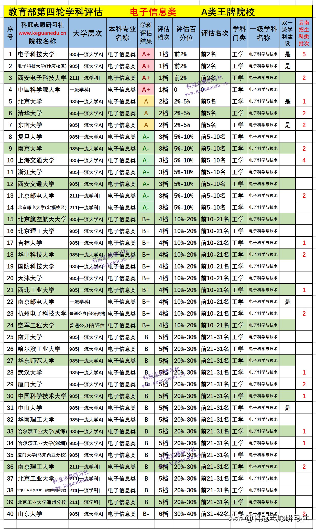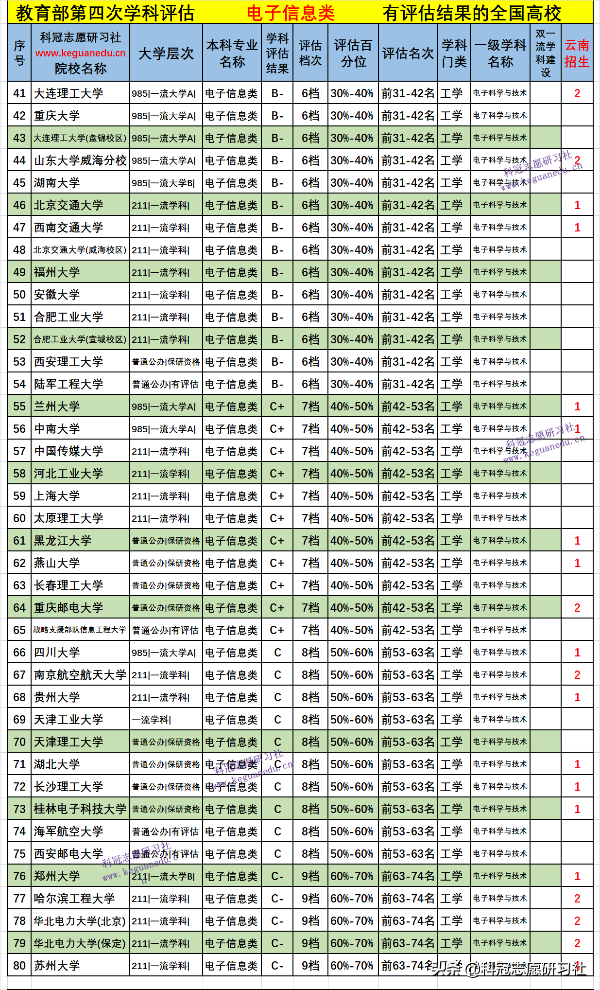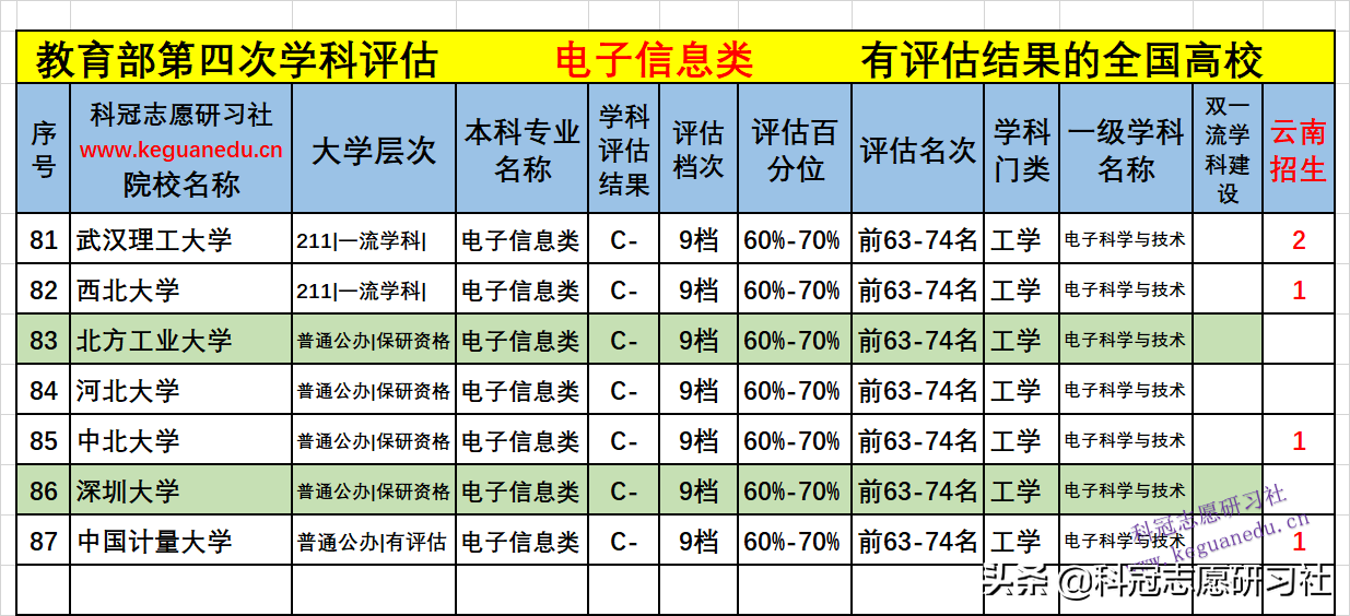 全国高校开设 电子信息类 专业的全部院校在教育部第四轮学科评估中有评估档次的院校共有 87 所,其中只有 4 所院校是全国:电子信息类的顶级王牌专业!有6 所院校是双一流学科建设的专业!有评估档次的院校2021年在云南招生的院校 43所,全国高校在各批次招生的有 186 所。详见下表3。