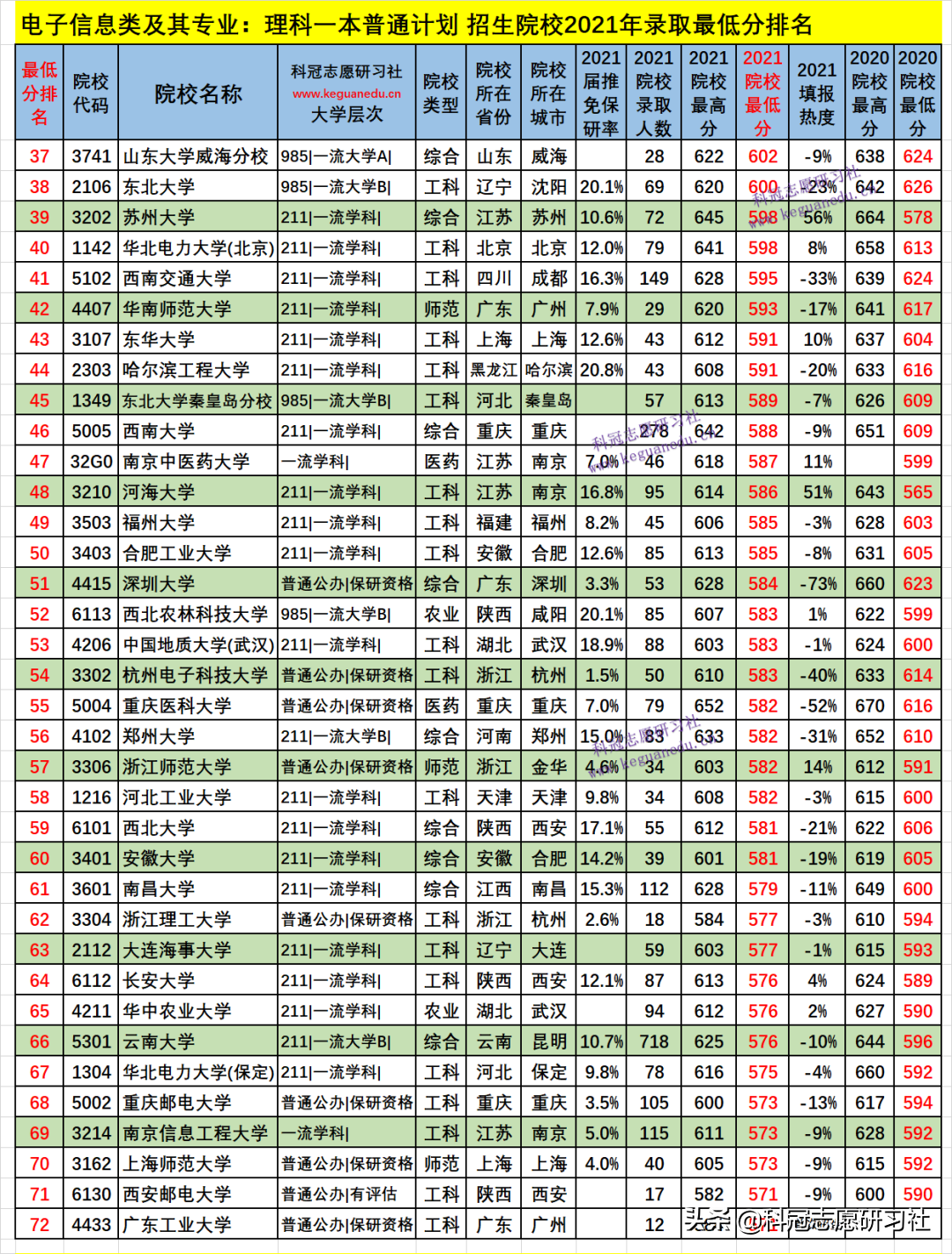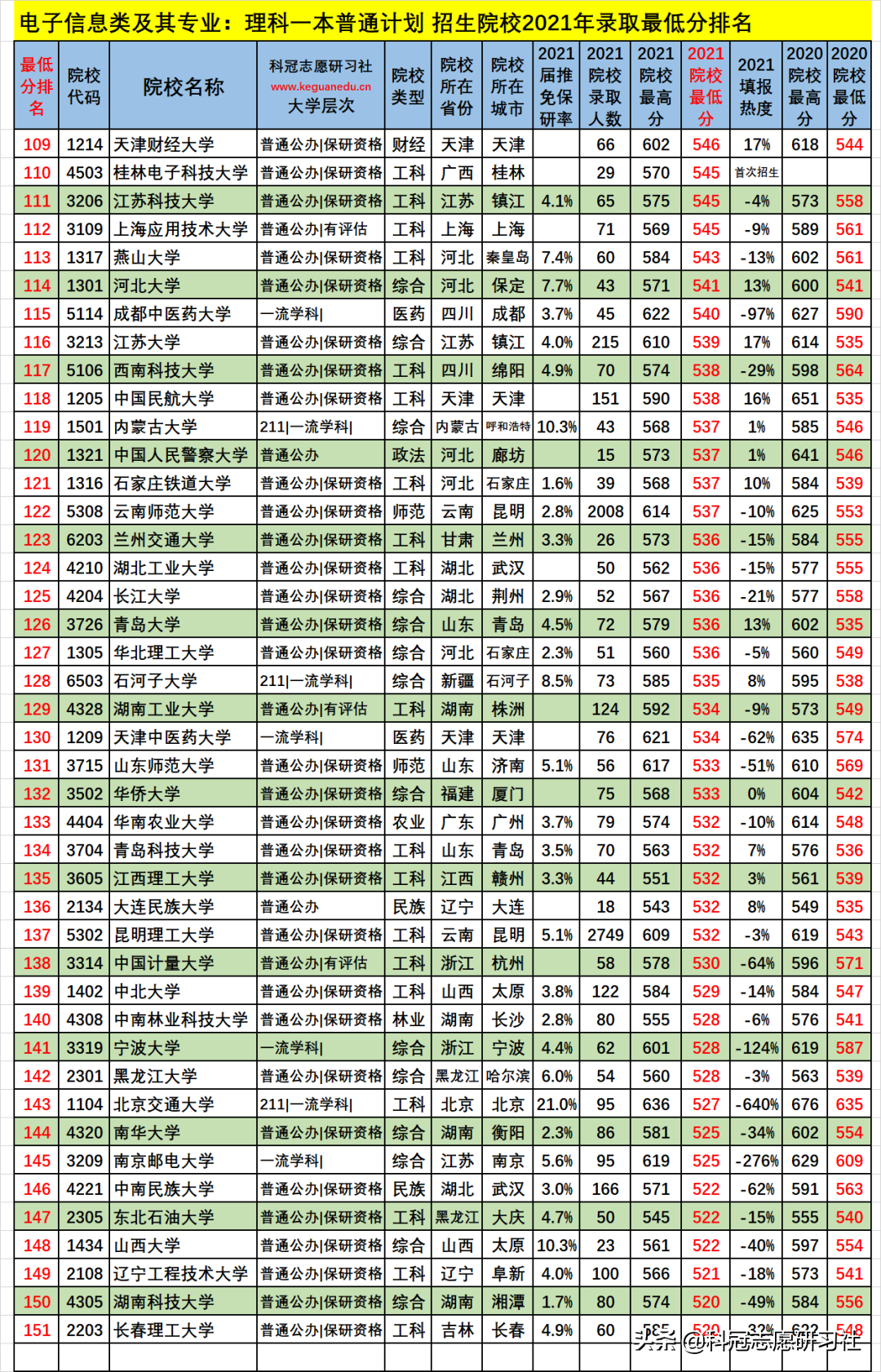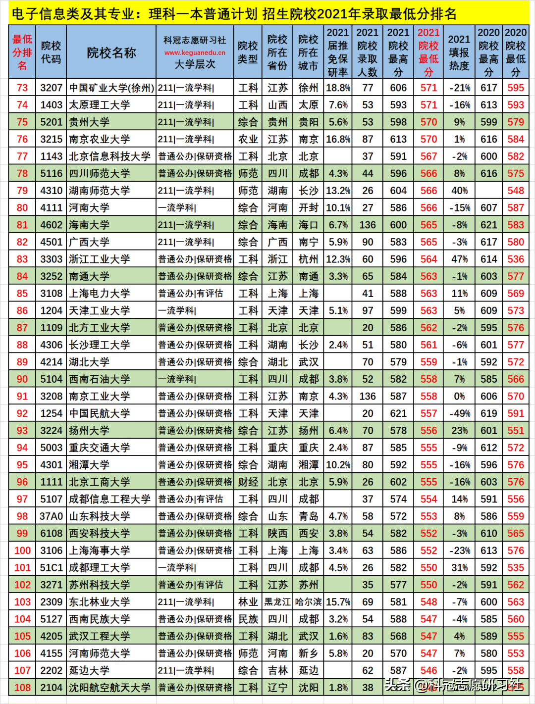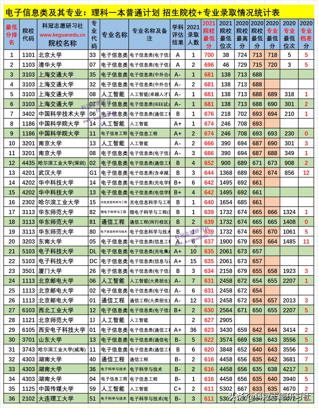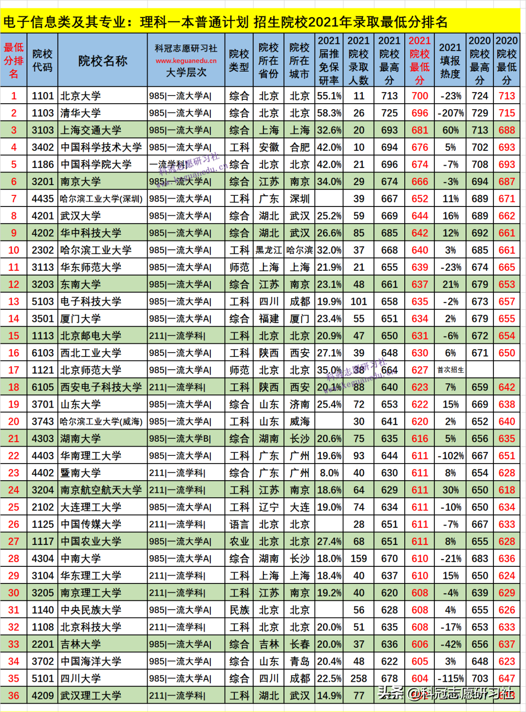 电子信息类及其专业:理科一本普通计划 招生院校数为 151 所,2021年院校最低分为 700-520 分,2021填报热度负波动最大的3所为:-640 %、北京交通大学(排名143 ),-276 %、南京邮电大学(排名145 ),-207 %、清华大学(排名2 );如此这样的负波动大的,其录取最低分和位次比上年要低,今年可以“捡漏”,而明年的录取位次一般情况又会提高;正波动最大的3所为:60 %、上海交通大学(排名3 ),56 %、苏州大学(排名39 ),51 %、河海大学(排名48 );如此这样的正波动大的,其录取最低分和位次比上年要高,一般情况今年考生填报可能“滑竿”。