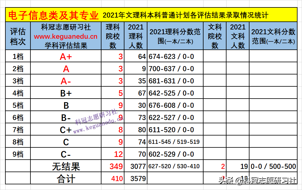 电子信息类及其专业,2021年文理科本科普通计划各评估结果录取情况统计 显示,顶级王牌A+院校文理科录取人数为64 人,院校数理科3所。有评估结果的院校录取人数,理科合计为502 人,占比14 %。