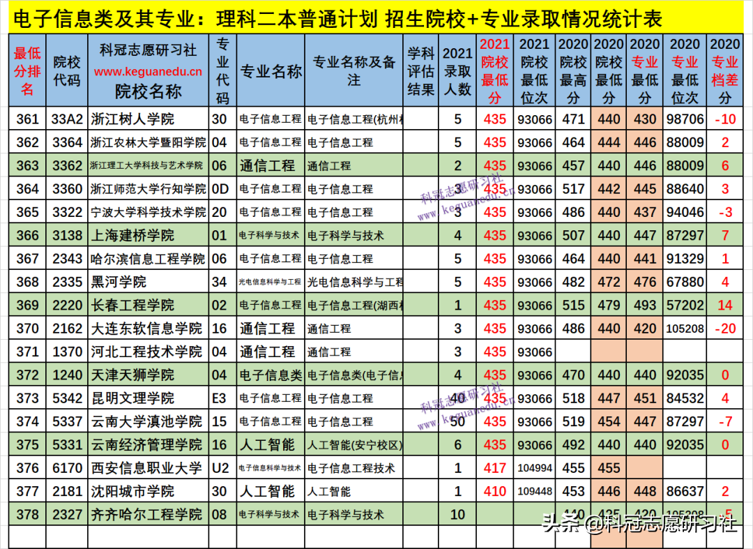 电子信息类及其专业:理科二本普通计划 招生院校+专业数为 378 所,大类招生即专业类:电子信息类 招生的院校有 39 所,这些院校一般在大一后二次分配专业。2020年专业档差分,为该院校电子信息类专业录取最低分减2020年院校最低分(原始志愿最低分,最冷门专业的最低录取分),该差值越大,说明该专业在该院校的填报热度越高、越热门!从下表统计可以看出,平均的专业档差分为5 分,平均热度较高,其中专业档差分最高的3所为:48 分的天津商业大学(排名86 ),40 分的大连大学(排名54 ),25 分的河南理工大学(排名75 ),如果要填报这些院校的此类专业,需要考虑上年的专业录取位次,否则会被专业调剂。若专业档差分为负值,说明该专业分是征集志愿分。