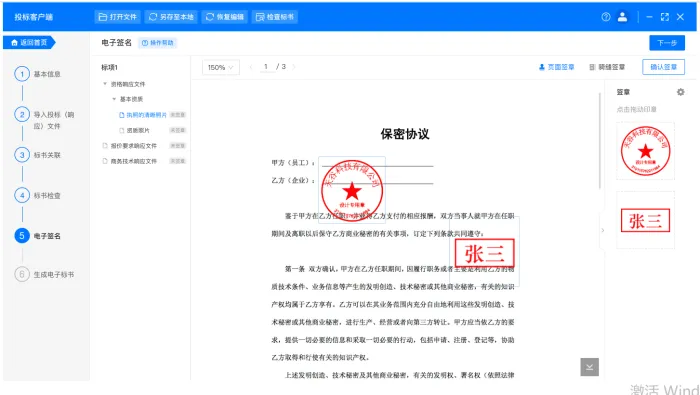 打开标书文件后,管理员或经办人可根据投标要求选取对应的印章,拖拽印章单次或批量落印,支持骑缝章、指定页面签章。高效、准确地完成标书盖章后,进行意愿认证,确保签署全流程合规可控。