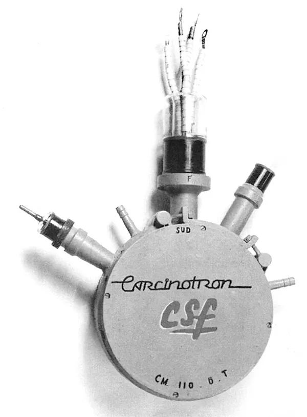 在大约20年的时间里,美国和欧洲的电子干扰器都使用电子回旋加速器作为其射频电源。此处显示的电子管是CSF在1952年制造的第一支电子管。它在S波段提供了200 W的RF功率,该功率从2 GHz扩展到4 GHz。