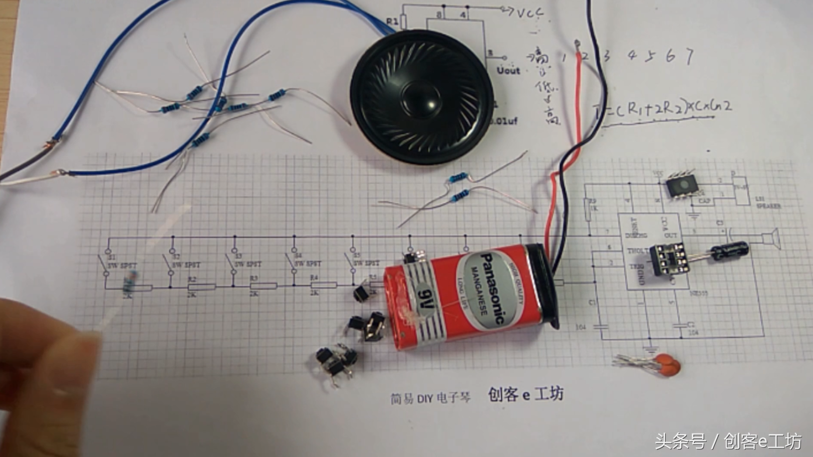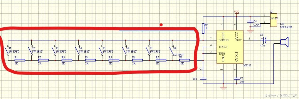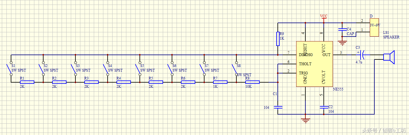 当S1闭合时,NE555多谐振荡器里的R2=R1 +R2+…+R8),通过公式计算频率f=1/T=1/((R1+2R2)C ln 2),如此类推,当不同的按键闭合时,R2的阻值不一样,能输出不同的波长,及不同的音阶,从3号引脚输出,通过一个耦合电容,通过喇叭放出来。喇叭的声波频率与DIY电子琴相同。