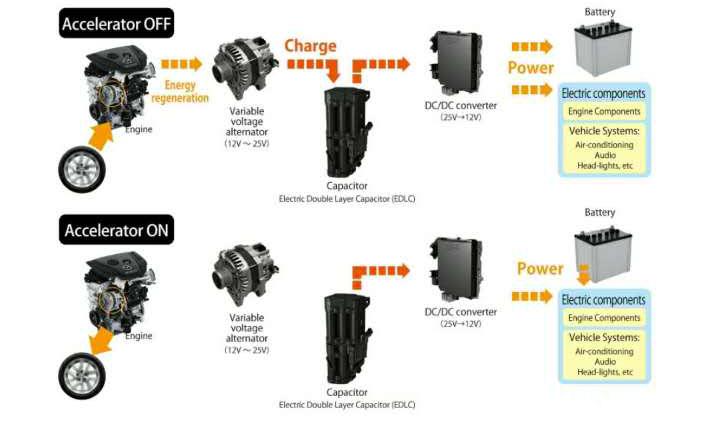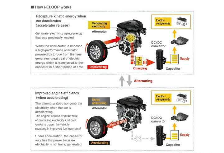 i-Eloop系统以一具可变电压发电机,加上低电阻双电层电容作为储电装置,搭配直流电压转换器,当驾驶放开油门减速时,便会进行充电,电力主要供应给车内的空调、音响或电气系统,节省燃油消耗。