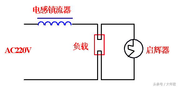 如下图,施加220V 交流电源时,电流流过镇流器,灯管灯丝启辉器给灯丝加热(启辉器开始时是断开的,由于施压了一个大于190V以上的交流电压,使得启辉器内的跳泡内的气体弧光放电,使得双金属片加热变形,两个电极靠在一起,形成通路给灯丝加热),当启动器的两个电极靠在一起,由于没有弧光放电,双金属片冷却,两极分开,由于电感镇流器呈感性,当电路突然中断时,在灯两端会产生持续时间约1ms的600V—1500V的脉冲电压,点亮灯管,其确切的电压值取决于灯的类型。
