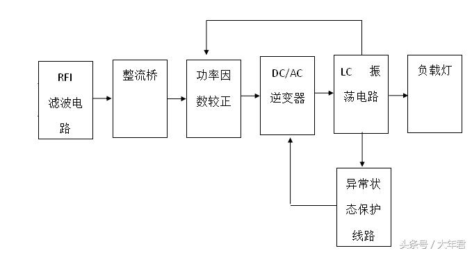 如下图,市电经过射频干扰(RFI)滤波器,全波整流和功率因数校正器(PPFC或APFC)后,变为直流电源。通过DC/AC变换器,输出20K—100KHZ的高频交流电源,加到与灯连接的LC串联谐振电路加热灯丝,同时在电容器上产生谐振高压,加在灯管两端,促使灯管“放电”变成“导通”状态,再进入发光状态,此时高频电感起限制电流增大的作用,保证灯管获得正常工作所需的灯电压和灯电流,为了提高可靠性,常增设各种保护电路、如异常保护、浪涌电压、电流保护、温度保护等等。