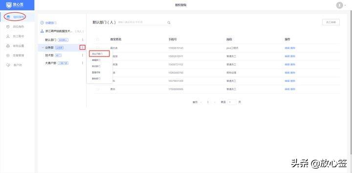 创建一级以下部门:选择要创建子部门的上级部门,然后通过菜单唤出创建按钮“添加子部门”。