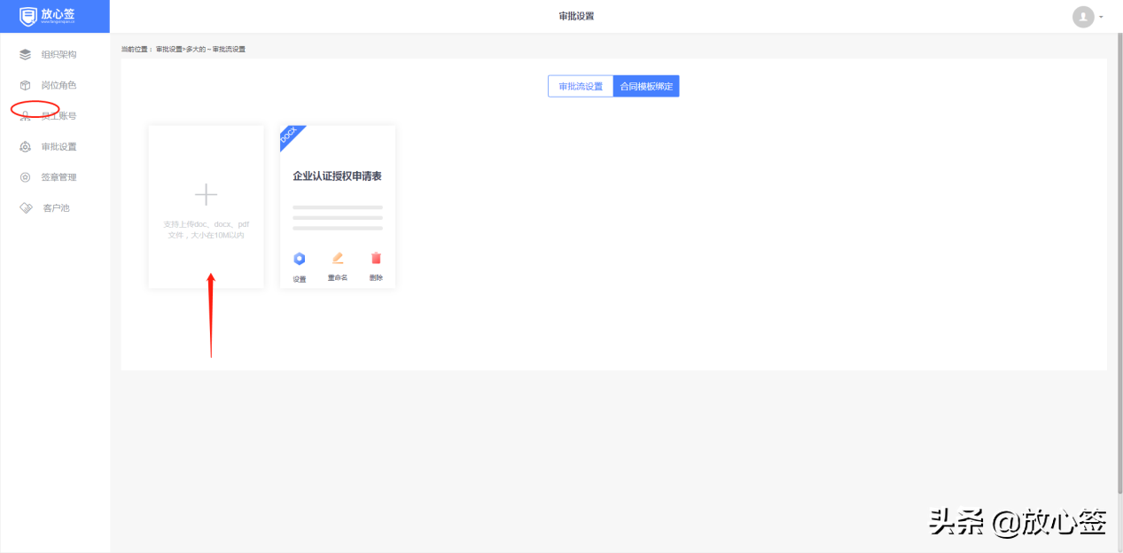 选择要挂靠的审批流,在审批流列表的操作列,点击按钮‘设置’,进入审批流设置页,然后继续切换到合同模板绑定页面,此时,点击按钮即可上传合同模板,如下图所示: