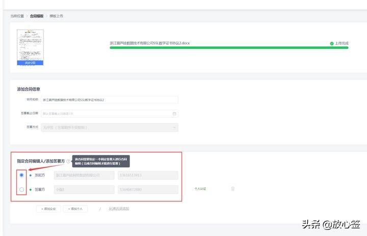 ④上传或调用模板后,可以正式地进行合同发起的操作。我们可以修改合同名称、签署截止日期(基础版签署方式仅支持最常规的无序签署),以及添加签署方。签署方可以是企业(必须是已认证过的企业)或个人,且身份一定不能填错哦;签署方也可以是多个;历史发送人可通过通讯录添加。