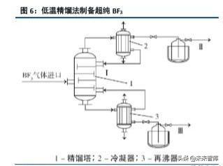 高纯 BF3即主要使用低温精馏的方式提纯,流程如下图所示,低温精馏塔的具体设置为精馏塔中部温度为 -96℃左右,下部温度为-98℃左右。BF3进入精馏塔,通过精馏塔温度的控制可以使 BF3以气态的形式从精馏塔 的上端进入冷凝器,而 SiF4 以液态的形式从底端进入再沸器,从而进行低温精馏操作,实现两种物质的分离, 但该方法能耗比较大,操作条件要求严格。