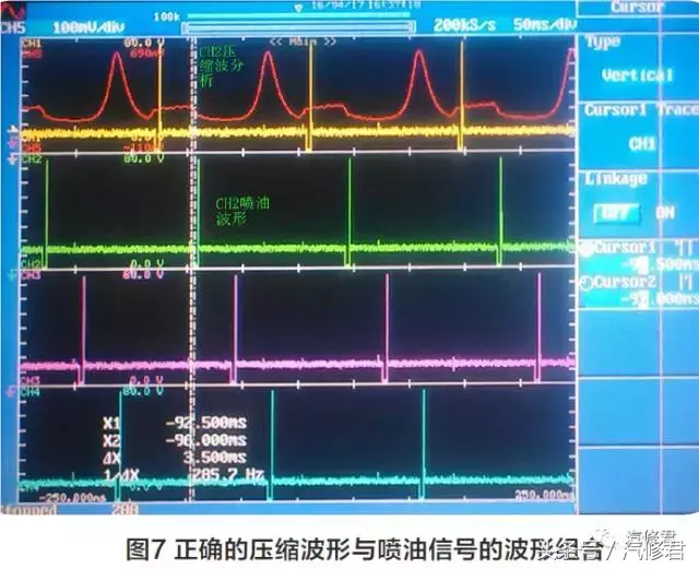 结合图6 (汽缸压缩波分析)就可以分析出图5的喷油时 刻是在压缩状态下喷油,这是不正确的(CHI黄色喷油波形与 CH5汽缸压缩波形)。图7为正确的压缩波形与喷油信号的波 形组合。