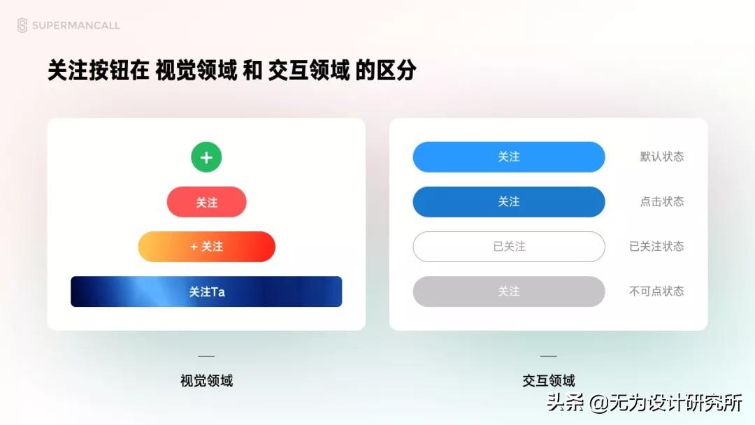 比如关注按钮,在视觉领域中,在意的是它的长宽比、图标样式、文字占比。但在交互领域,关注的是它包含的所有状态和互动反馈。