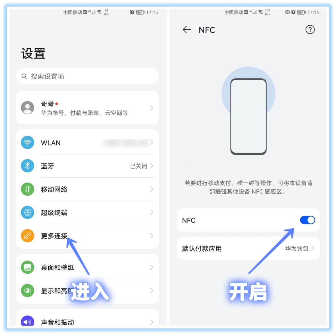 现在的智能手机基本上都可以读取身份证,这里以华为手机为例,首先我们打开手机的设置,找到「更多连接」,进入后开启“NFC”功能。