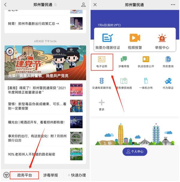 1.市民通过微信搜索“郑州警民通”,进入郑州警民通【政务平台】便民功能菜单栏,完成实名认证后,找到“电子证照”模块进行申领。