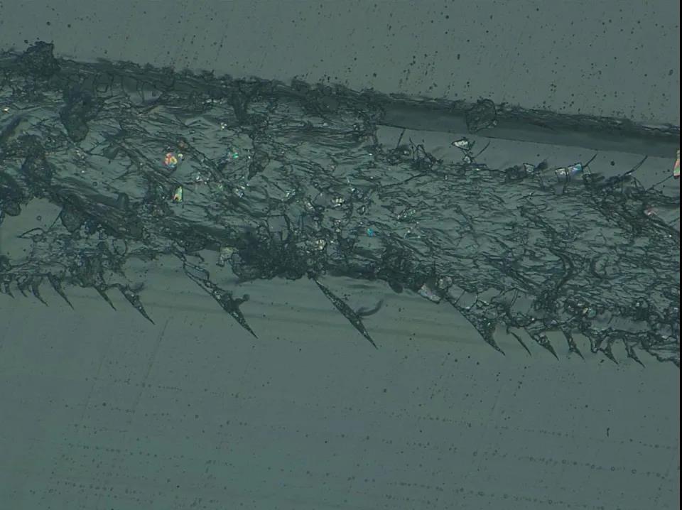 08.液晶屏上划痕 使用传统金相显微镜看液晶屏上细微划痕时,也很难看到划痕的细节,这样就必须使用 SEM 来完成检测。将Leica DVM6的“景深叠加功能”与“斜照明功能“组合使用,可观察到玻璃面上划痕的所有形貌。