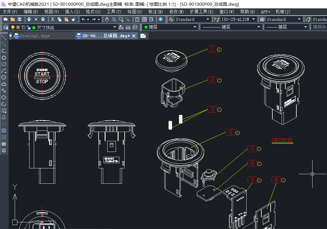作为一款成熟的国产CAD软件,中望CAD在汽车零部件行业得到广泛应用,帮助工程师提高工作效率。下面,我们以启动开关这一零件为例,具体了解和学习如何借助中望CAD软件快速绘制出符合生产车间要求的工程图纸(如下图所示)。