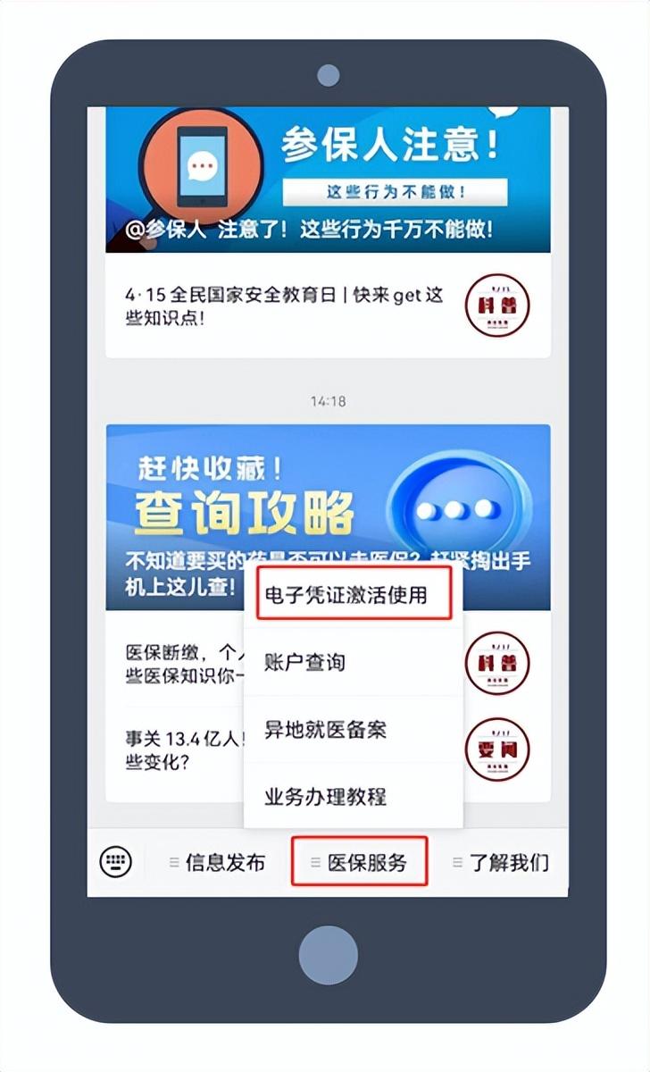 关注“中国医疗保险”微信公众号。点击菜单栏“医保凭证”-“医保电子凭证”进入页面进行激活操作。