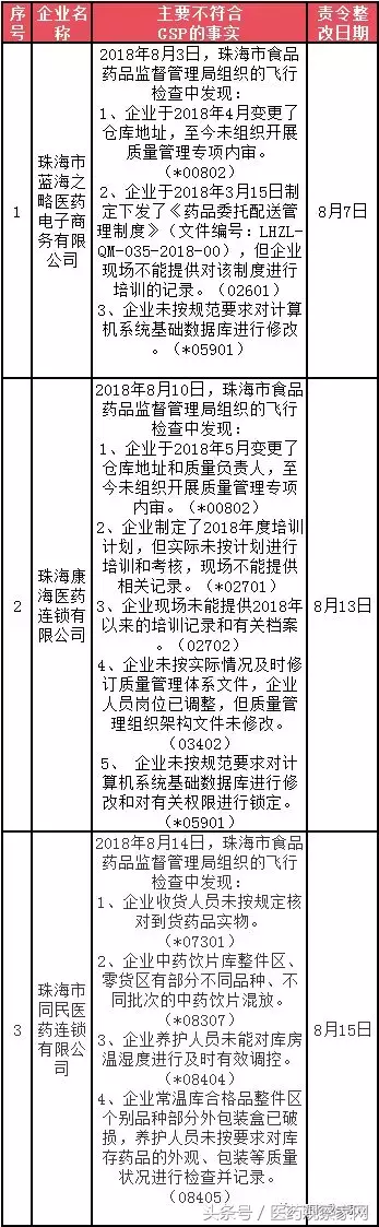 珠海市蓝海之略医药电子商务有限公司、珠海康海医药连锁有限公司、珠海市同民医药连锁有限公司 3家企业不符合《药品经营质量管理规范》规定,该局依据《药品医疗器械飞行检查办法》(国家食品药品监督管理总局令第14号)的有关要求,依法责令其限期整改。