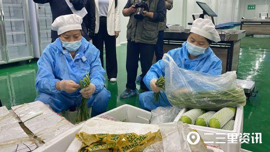 康海农副产品加工配送有限公司总经理张忠介绍,这批蔬菜都是当天刚到的新鲜蔬菜。所有蔬菜运送到车间后,必须进行取样检测,检测数据合格后,才会让工作人员卸货,不合格则整批退回。另外,采购回来的蔬菜,前期需要进行人工切根和挑选,选出优质的蔬菜后再放入清洗机。