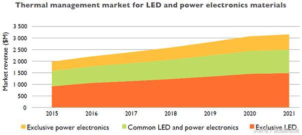 电力电子和LED产业需要合适的材料来解决热管理挑战。这些应用都受到相似的技术要求推动,应用于某一种产业的技术解决方案,可以通过调整和开发而应用于另一种产业。这两个产业的热管理材料总市场中,有大约30%具有共通性,这部分市场2015年达到了6.6亿美元,预计到2021年将增长至10.14亿美元。总市场的另外30%,可以通过对现有技术的适应性改良而应用于另一产业。