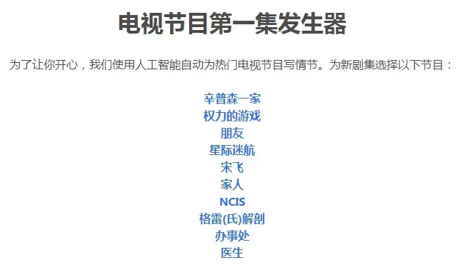 电视剧本生成器是一个可以为电视剧创作剧本剧情的AI,其中包括了《辛普森一家》、《权利的游戏》、《星际迷航》等多部知名影视剧,可以帮助一些影视剧粉丝拓展出更多剧情,让大家能够继续「追剧」。