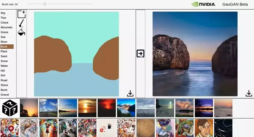 gaugan是一个基于生成对抗性网络(GAN)的AI项目,由知名计算机公司英伟达制作,可以将大家的随手涂鸦转换成精致的风景照片,拯救绘画手残党。