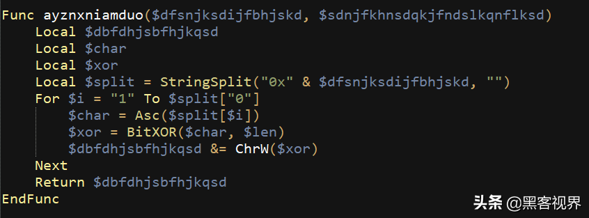 分割加密的样本,并在AutoIt脚本内拼接为十六进制字符串。分割加密的样本并将其转换为反向十六进制字符串,并将其作为资源附加到AutoIt可执行文件。分割加密的样本,并将其作为资源附加到AutoIt可执行文件中。结论