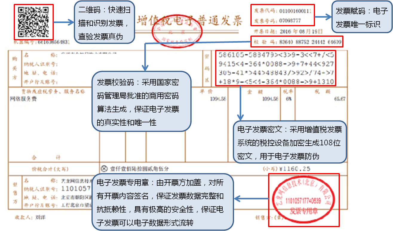 电子发票专用章,即开票企业的发票专用章,由开票方加盖,利用密码技术,对所有开票内容进行签名、签章,保证电子发票数据完整和抗抵赖性,具有极高的安全性,保证电子发票可以电子数据形式流转。