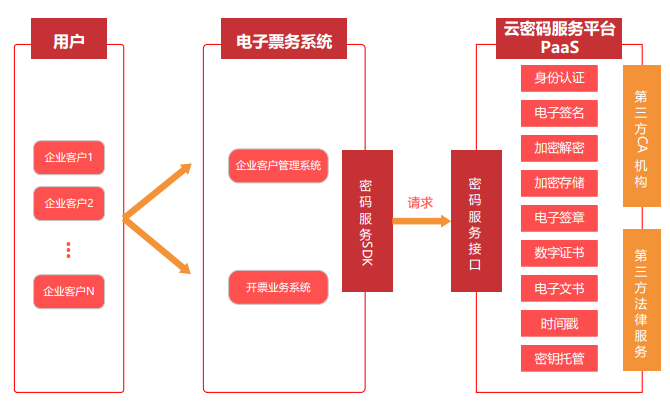 正元安服建设的云密码服务平台基于“互联网+安全服务”模式,对接电子发票系统平台,为电子发票开具、交付、查验、报销、入账等流程中的安全合规需求提供安全保障,提供数字证书、身份认证、数字签名、电子签章、时间戳、数据加密等云安全服务,保障电子发票全生命周期中的安全性、完整性、真实性、保密性,提供合法合规的电子发票安全服务解决方案。