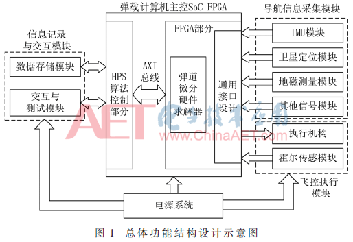 弹载计算机主要功能分为导航与飞控两部分,其中导航部分功能为接收来自惯性测量单元(Inertial Measurement Unit,IMU)、卫星定位、磁强计等导航设备的信息,并进行弹道解算与预测;飞控部分则主要根据导航处理所得结果进行飞行控制工作,以完成最终的制导目的[7]。以某型简易制导弹丸为例,本文提出的基于SoC FPGA的新型通用弹载计算机总体功能结构示意图如图1所示,包含IMU、卫星定位模块、地磁测量模块等。其中SoC的FPGA部分完成通用接口与弹道微分方程求解器设计,HPS部分完成对卫星定位信号、IMU信号、磁强信号等组合解算程序设计,同时将工作数据进行实时存储,并提供测试接口。