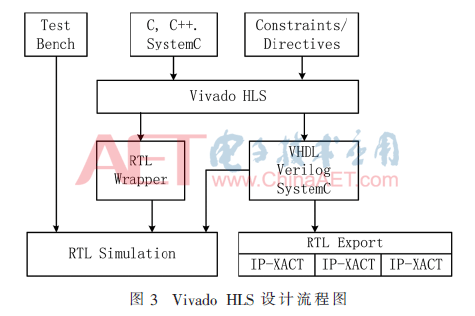 Vivado HLS是Xilinx推出的一款高层次综合工具,其使用C、C++或SystemC语言进行数字系统的描述,并将该系统自动转换成寄存器转换级(Regisiter Transfer Level,RTL)代码,即生成硬件IP核,以完成对串行程序的并行加速。其设计模式如图3所示。