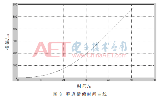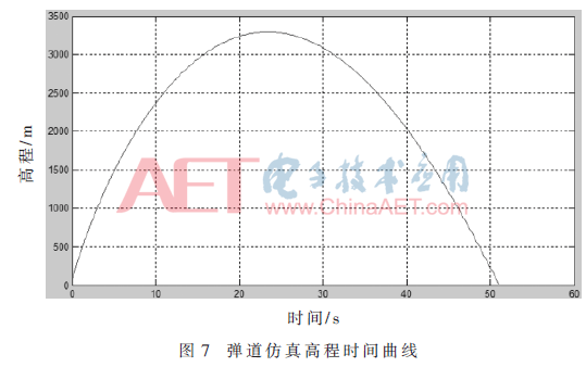 本次对比实验中,弹道仿真计算的预置参数为:射点与目标相距约9 200 m,横偏约600 m,弹药总计飞行约51 s。根据基于SoC FPGA的新型通用弹载计算机得到的结果绘制弹道仿真曲线如图6~图8所示。对于实时性要求较高的武器制导领域,本文提出的基于SoC FPGA新型通用弹载计算机完全满足计算性能要求。