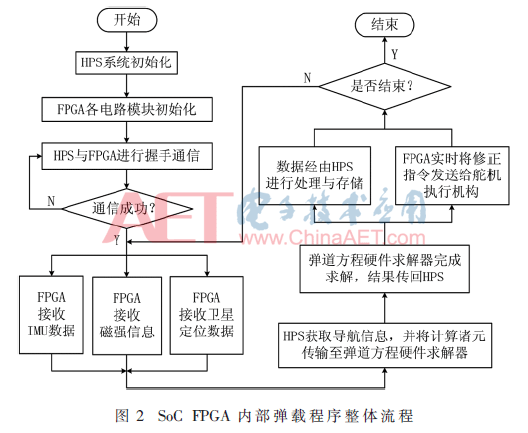 弹载程序计算的核心是实时测量导航数据,利用外部导航信息,快速地进行弹道诸元的求解,并得到修正指令,输出至舵机进行控制导航。如前文所述,本文新型弹载计算机方案采用FPGA部分进行外部数据接口通用设计,进行底层的采集与处理。待底层数据处理完毕后,HPS部分运行弹载程序逻辑,进行预定策略的执行与运算。当系统进行弹道微分方程求解弹道诸元时,HPS将数据通过AXI总线传输至FPGA部分,利用其中的弹道微分方程硬件求解器进行求解计算。当计算完毕后,一方面FPGA部分将结果返回至HPS,HPS进行进一步处理与存储记录;另一方面,FPGA部分综合计算计算结果与当前舵机状态,通过预定策略求得修正指令,实时发送至外部舵机执行机构进行控制。SoC FPGA内部弹载程序整体流程如图2所示。