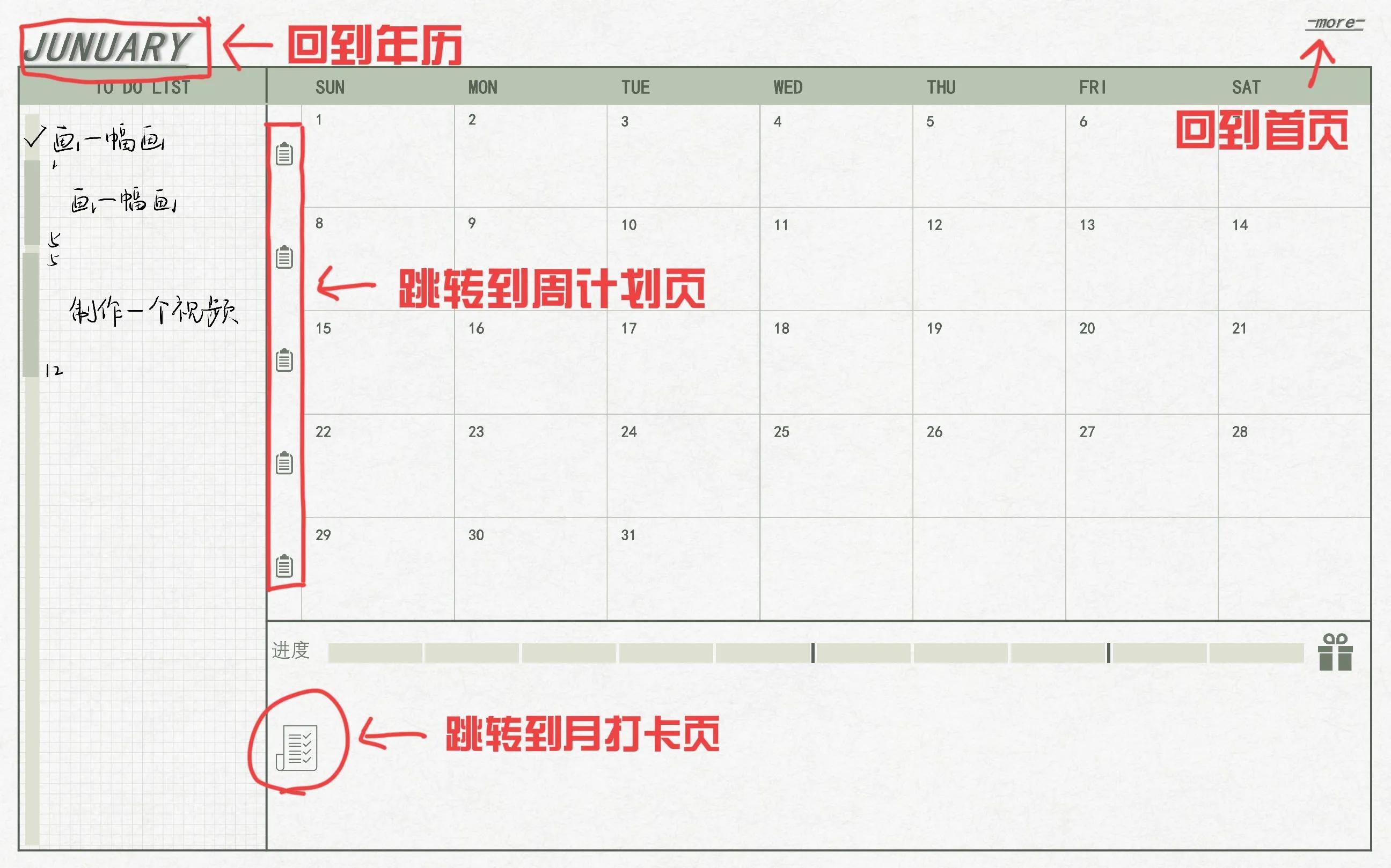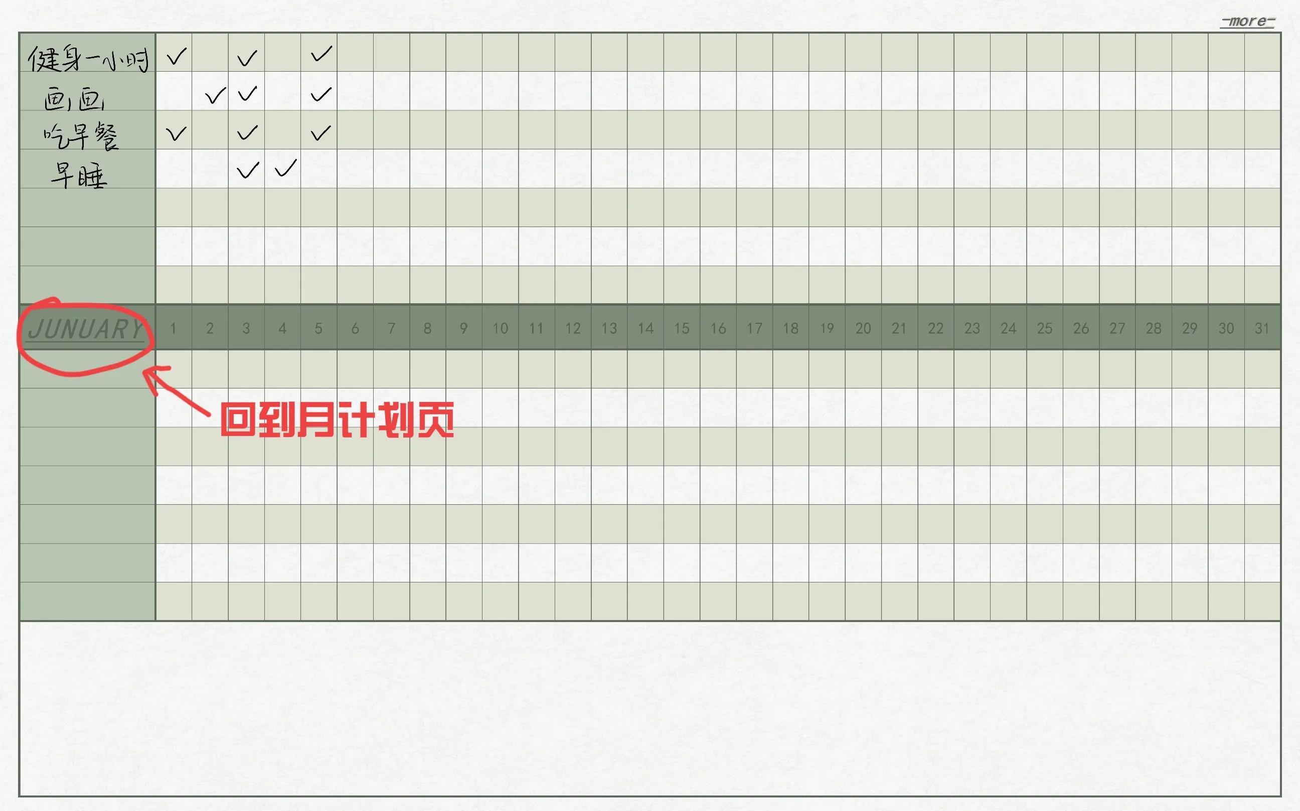 这个页面是用来自己想要养成的长期习惯,生活、学习各个方面的都可以。比如我会写健身一小时、早餐、画画、早睡,哪天完成了就打一个勾,月末就可以很直观地看到完成情况,这样有监督自己的作用。也不一定是每天都要做的事,像健身,我的目标是一周完成3天就达标,下面留了一些空间,也可以进行一些点结,点击标题栏中的“JANUARY”又可以回到这一月的月计划页。