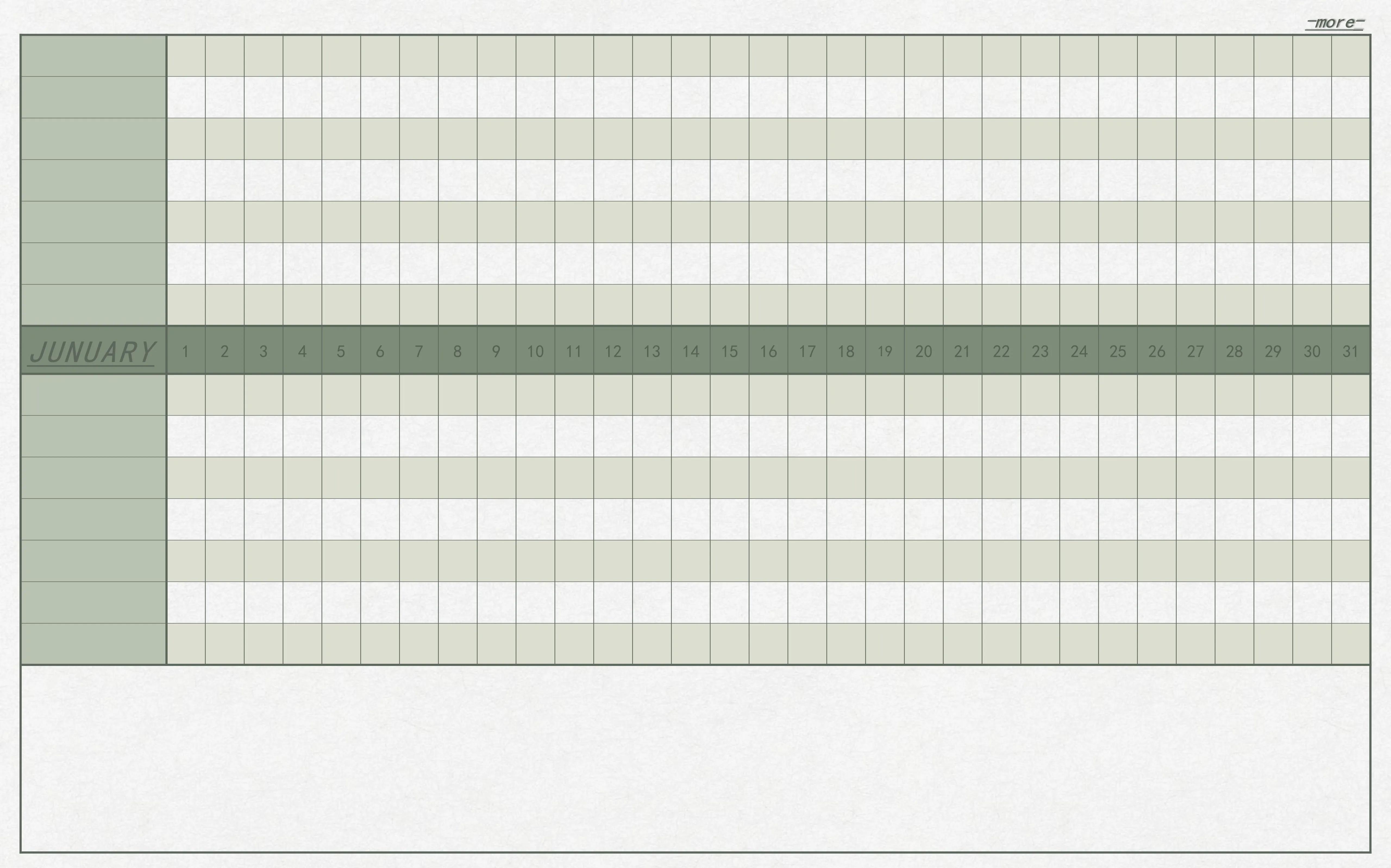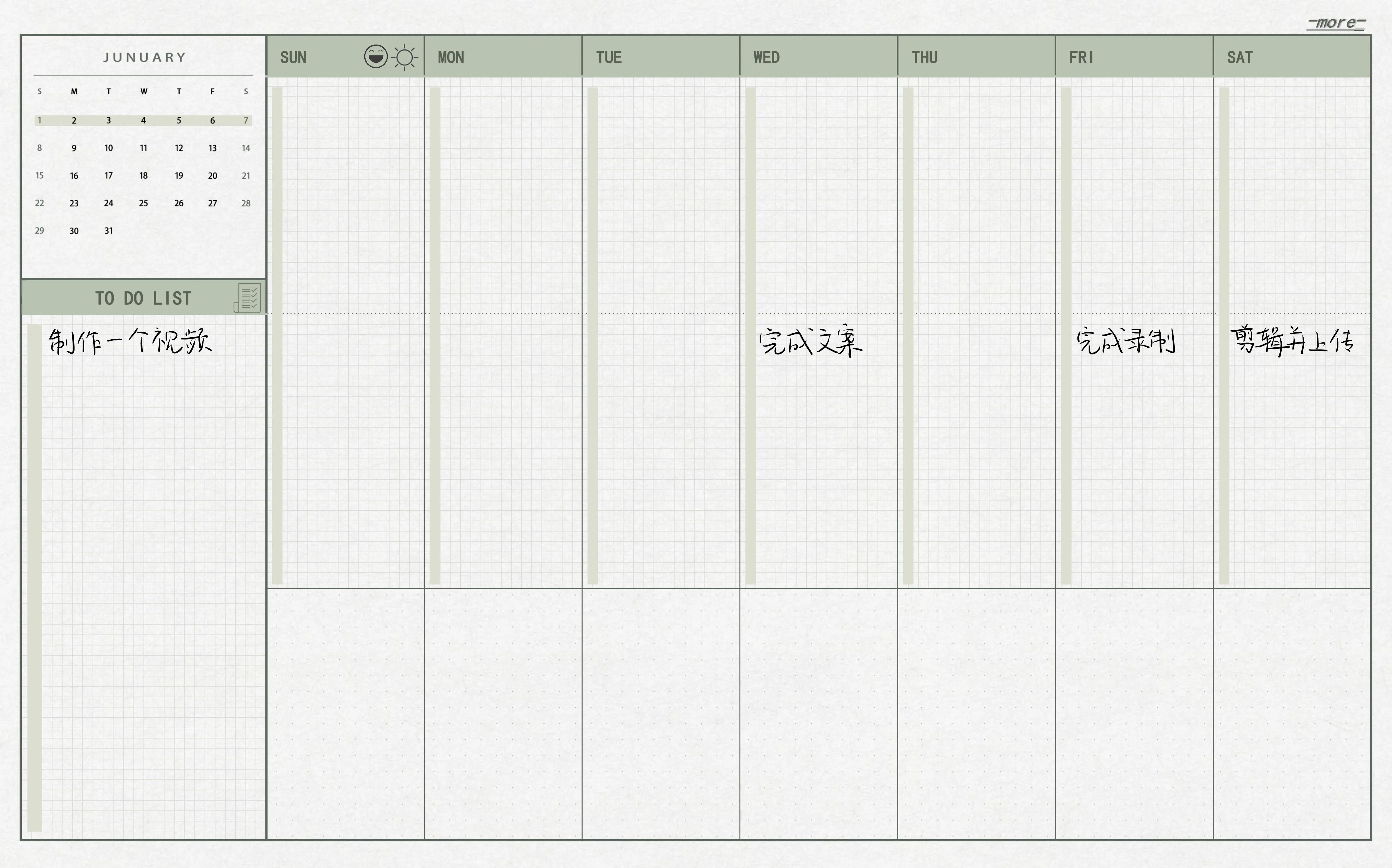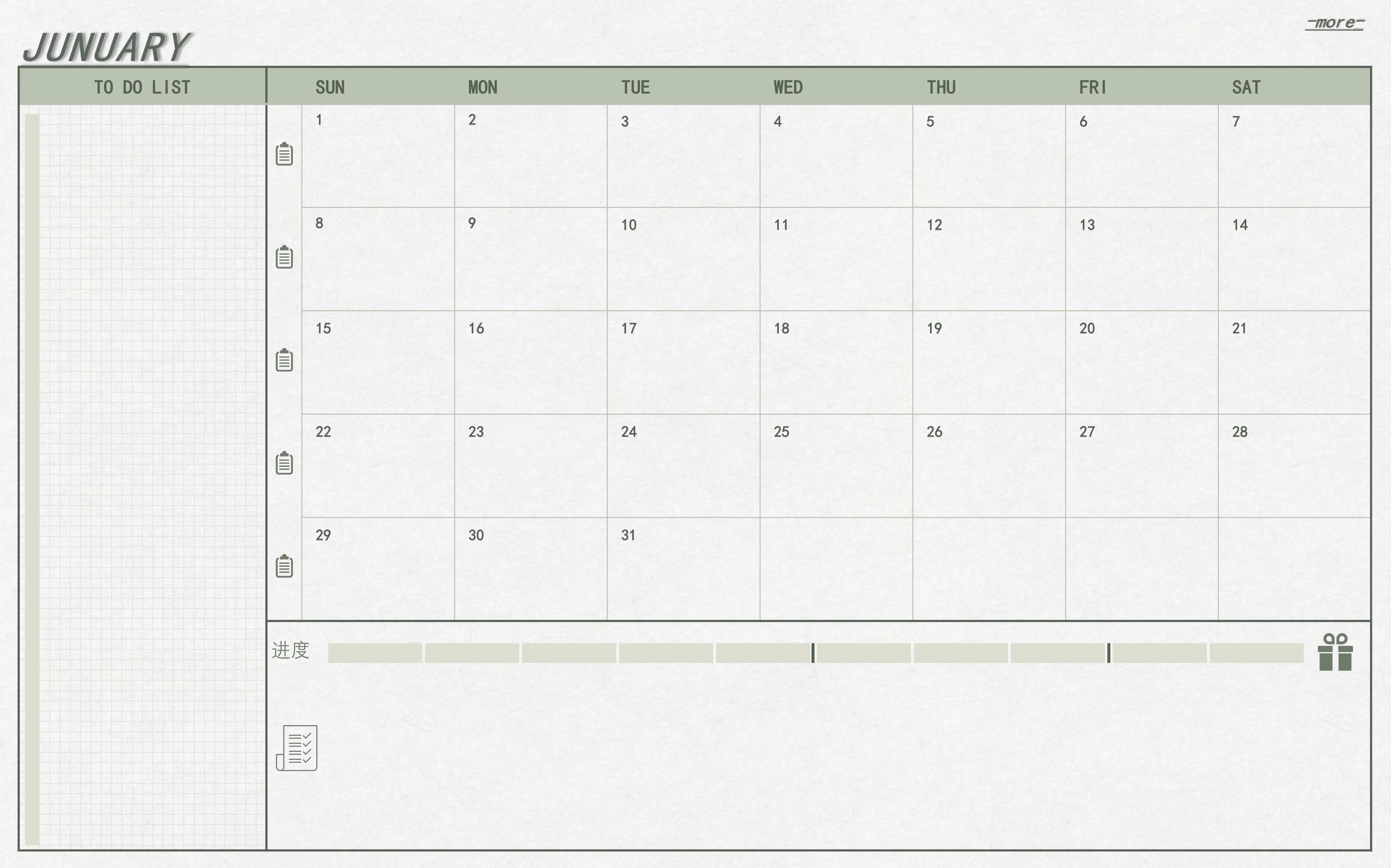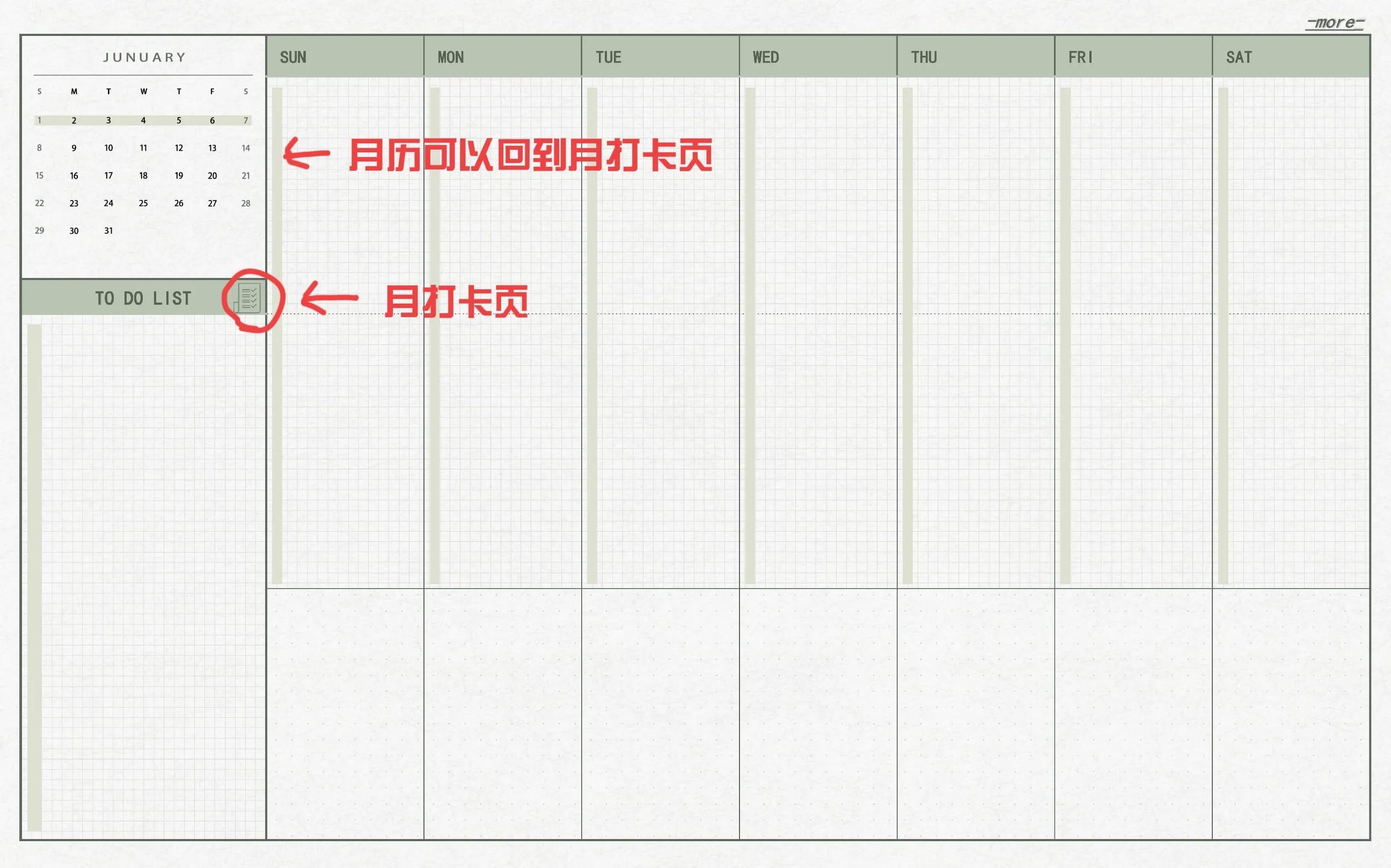 左上角的“JANUARY”标题设置了超链接,点击可以回到年历页面。左边是一栏“To Do List”,这里可以写下这一个月要做的事,可以是已经确定的事比如15号有一个会议要开,或是20号之前要完成一个任务;也可以是自己设立的目标,比如这个月要读完一本书。格纹我使用了方格纸,也是为了写内容比较自由,字大一点小一点都可以,左边那一条可以当做勾选框,一件事做完后在这里打勾;也可以把它当作时间轴来用,比如这个月1到5号我要画一幅画,5到12号做另一件事。