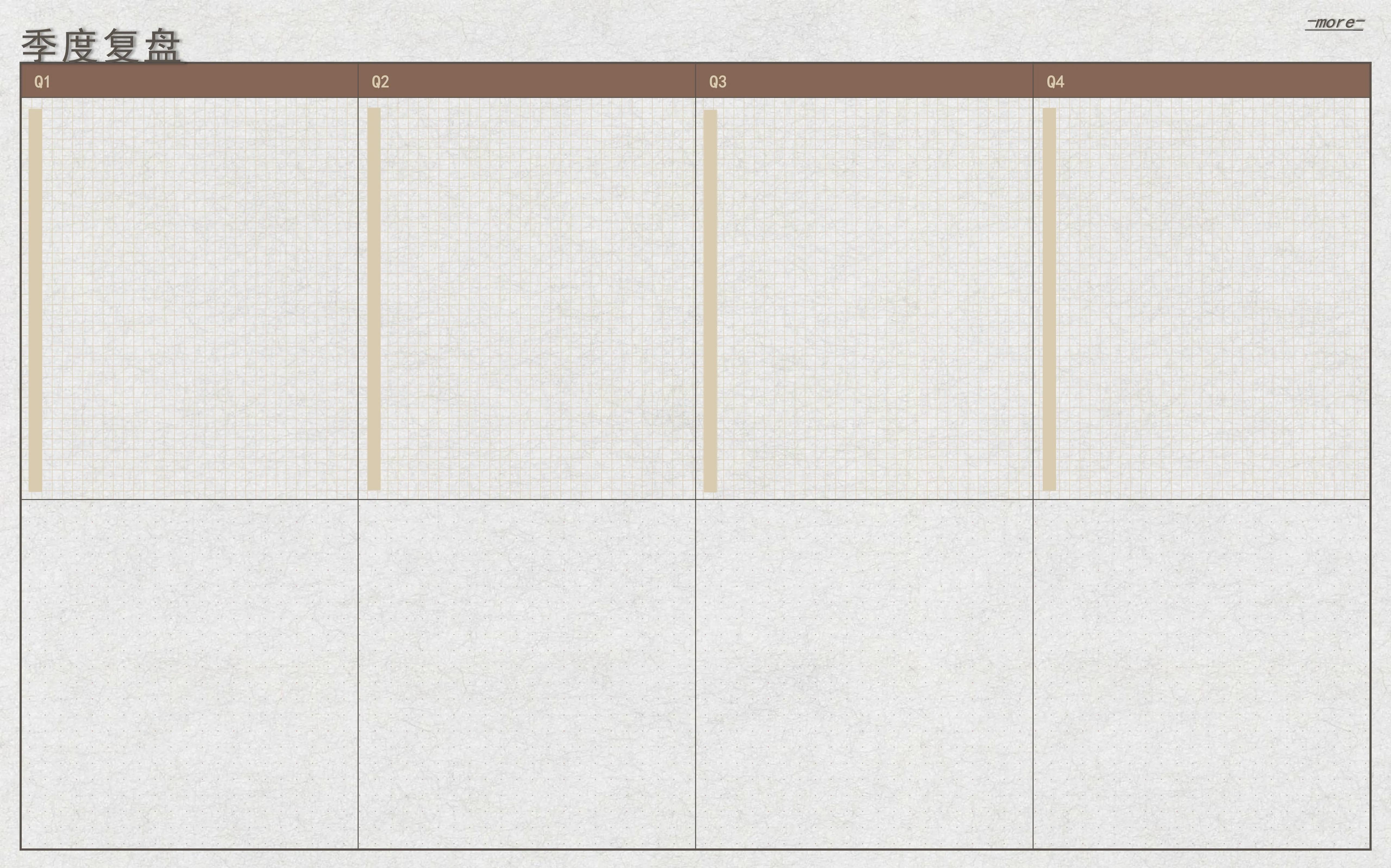 季度复盘,顾名思义,就是每季度的一个小总结,上半部分可以写自己完成的事项,下半部分可以简单地写几句话。